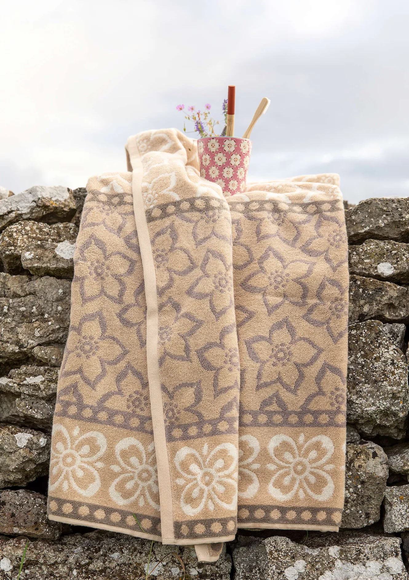 Badlakan med en mixad mönsterbild av blommor och prickar. Kontrastfärgad kant och hängare på kort- och långsidan.