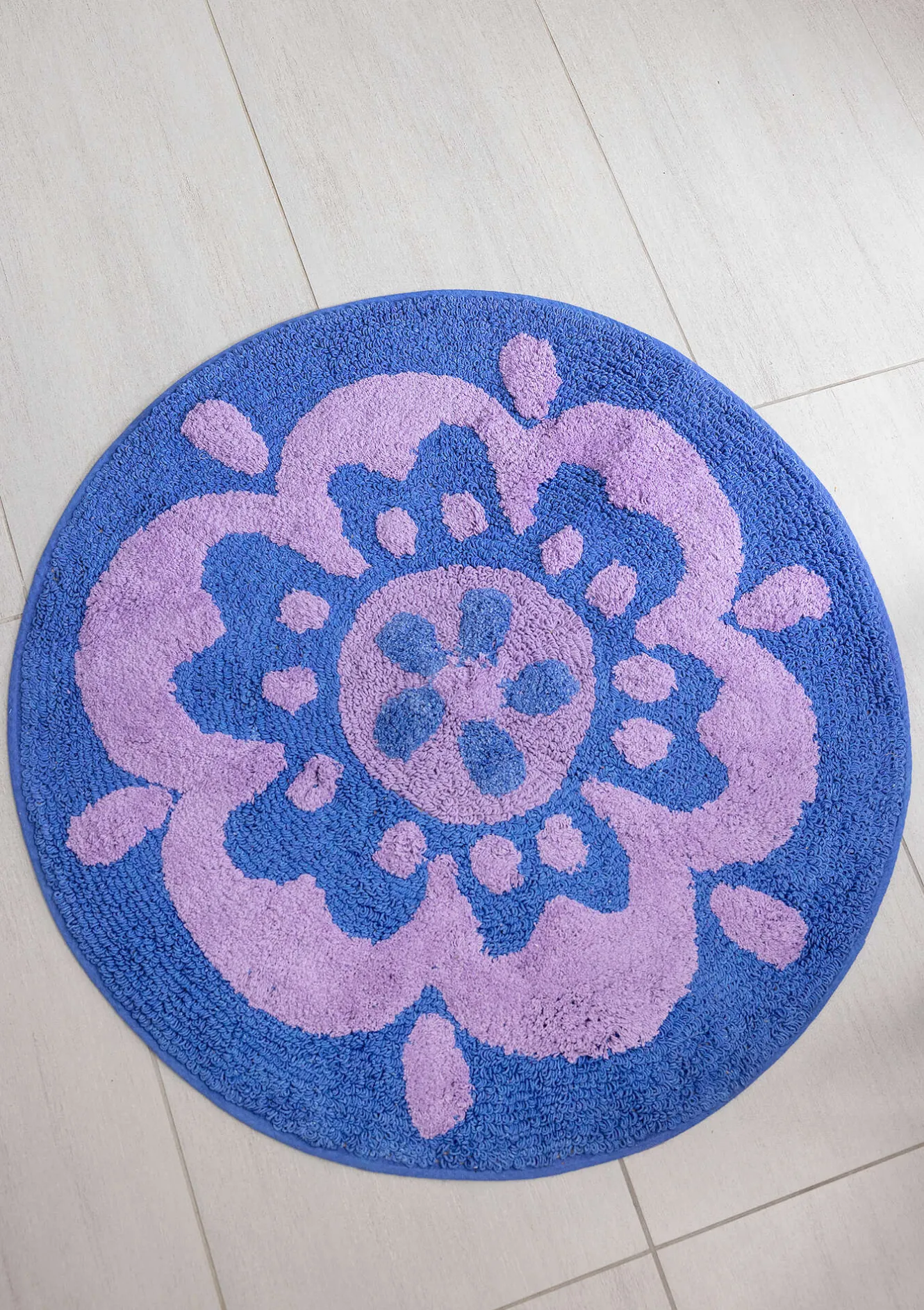 Rund badrumsmatta med en stor blomma. Tuftad med både öglor och klippt lugg, i två olika höjder. Halkskydd på undersidan.