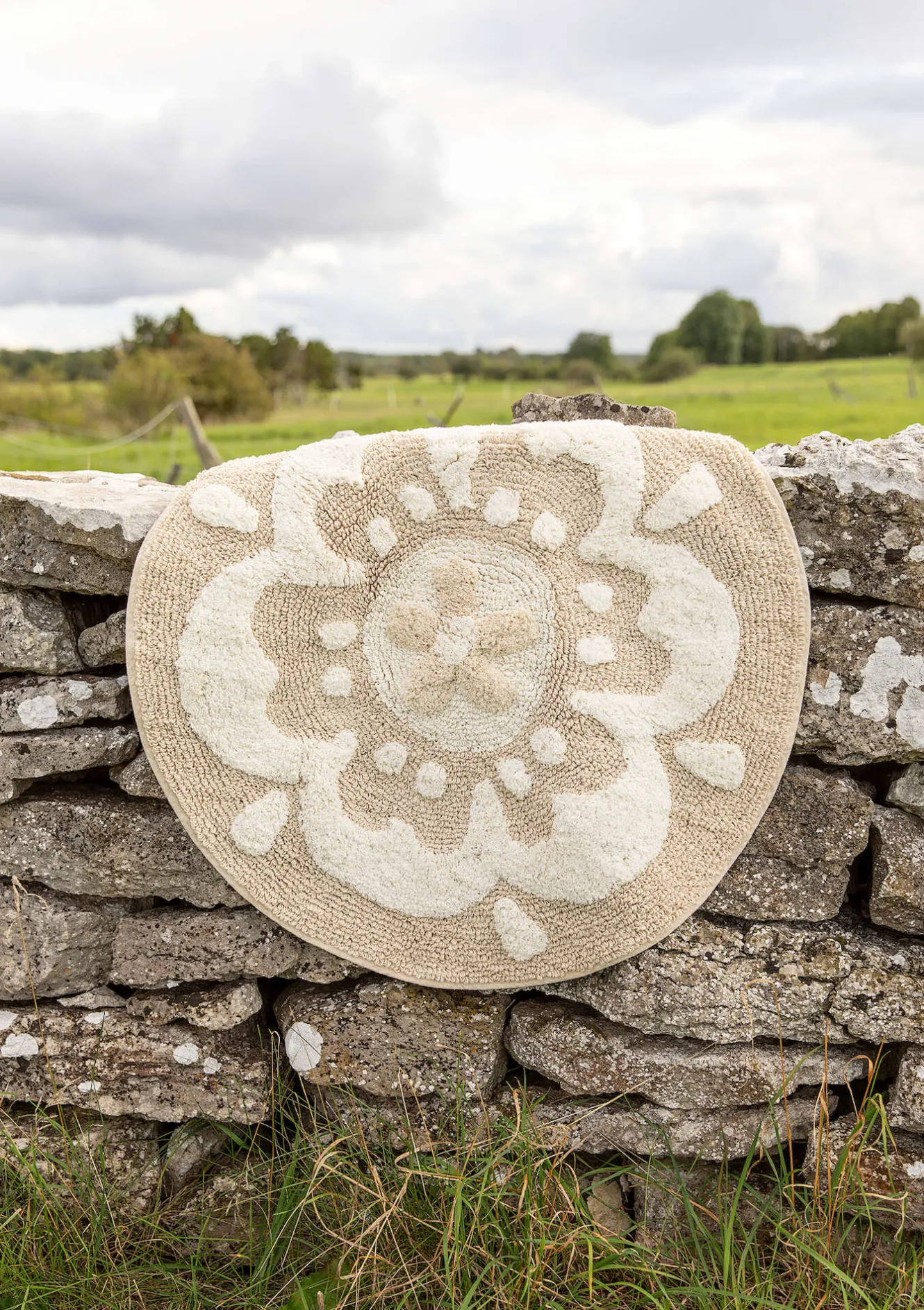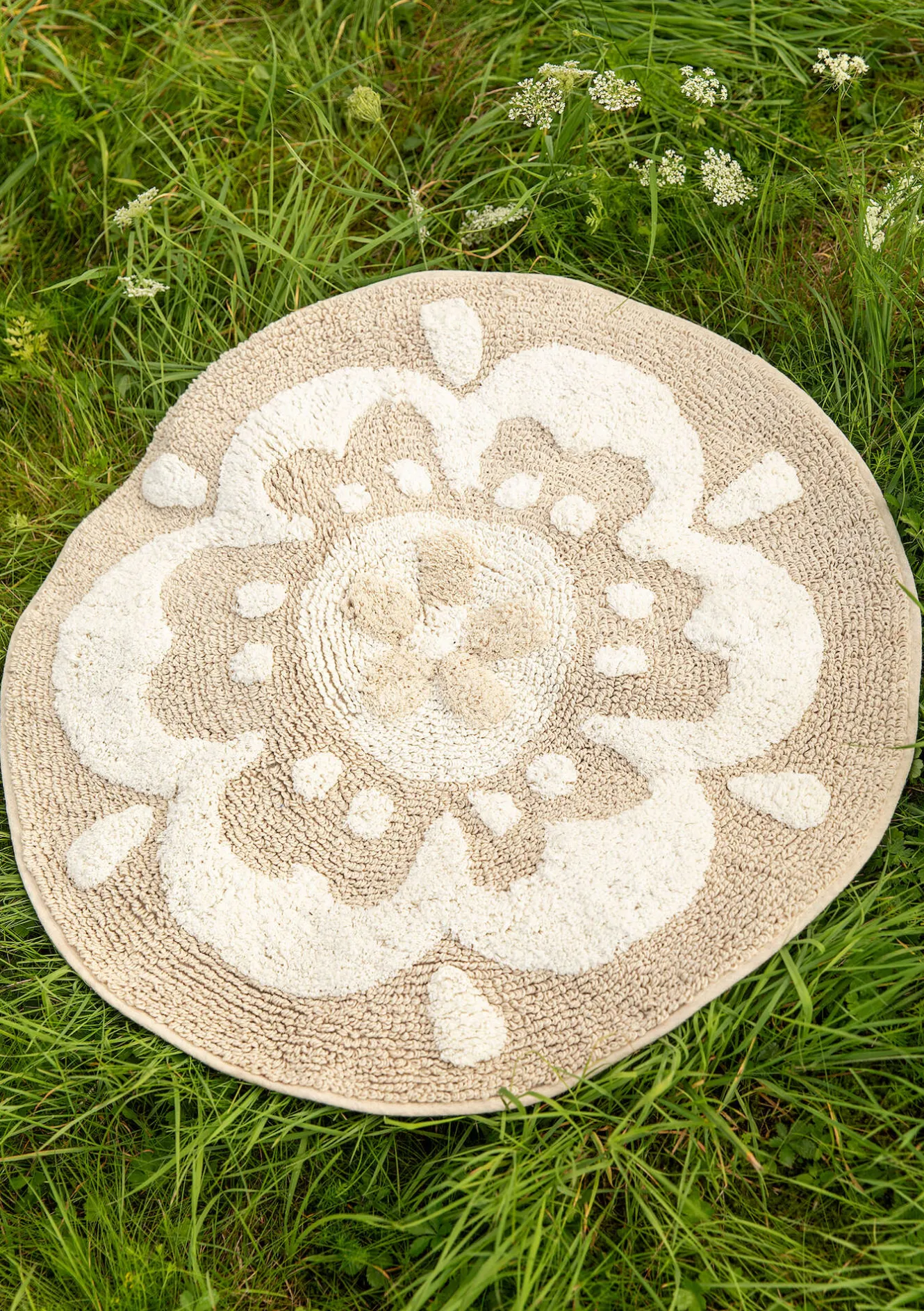 Rund badrumsmatta med en stor blomma. Tuftad med både öglor och klippt lugg, i två olika höjder. Halkskydd på undersidan.
