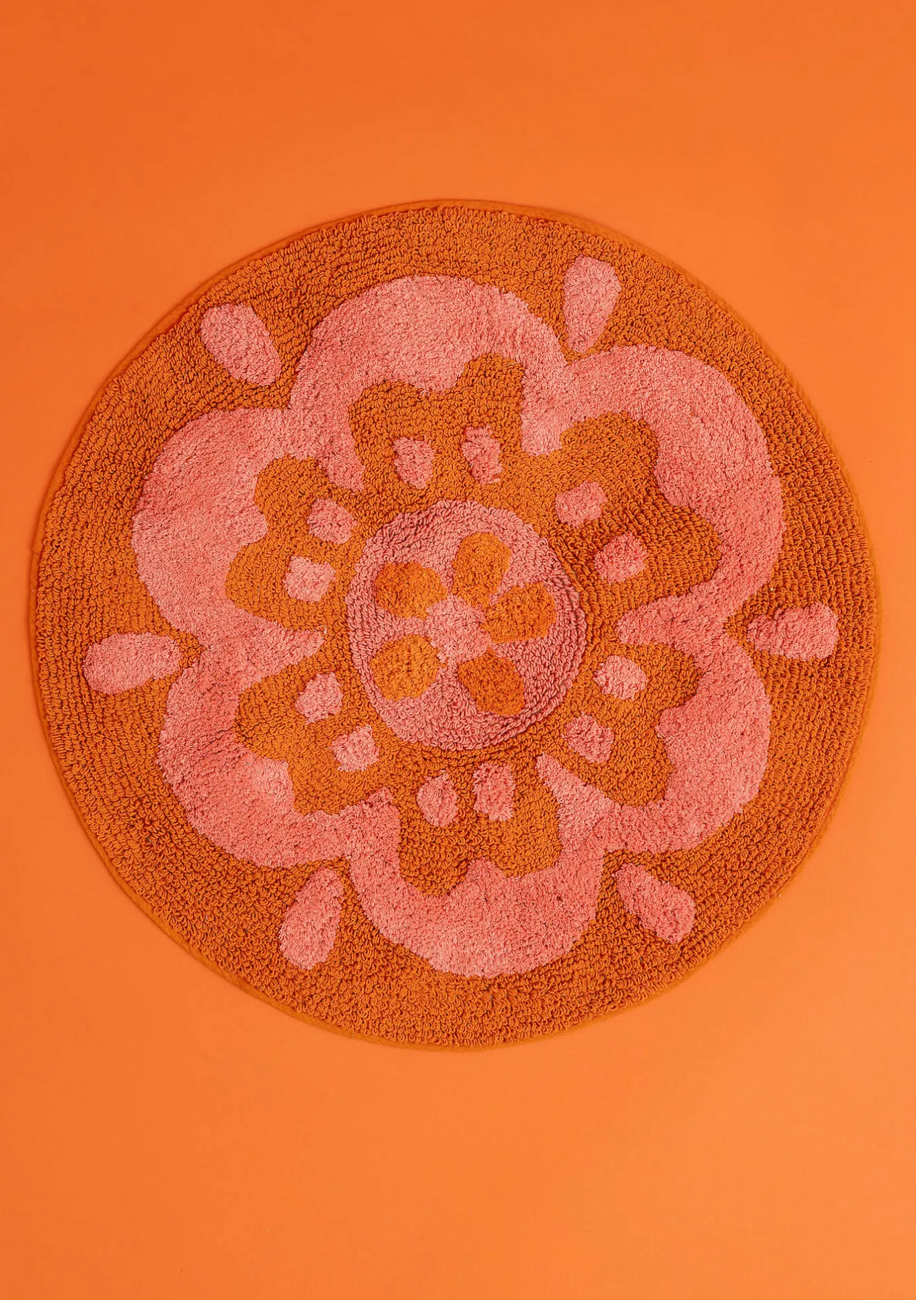 Rund badrumsmatta med en stor blomma. Tuftad med både öglor och klippt lugg, i två olika höjder. Halkskydd på undersidan.