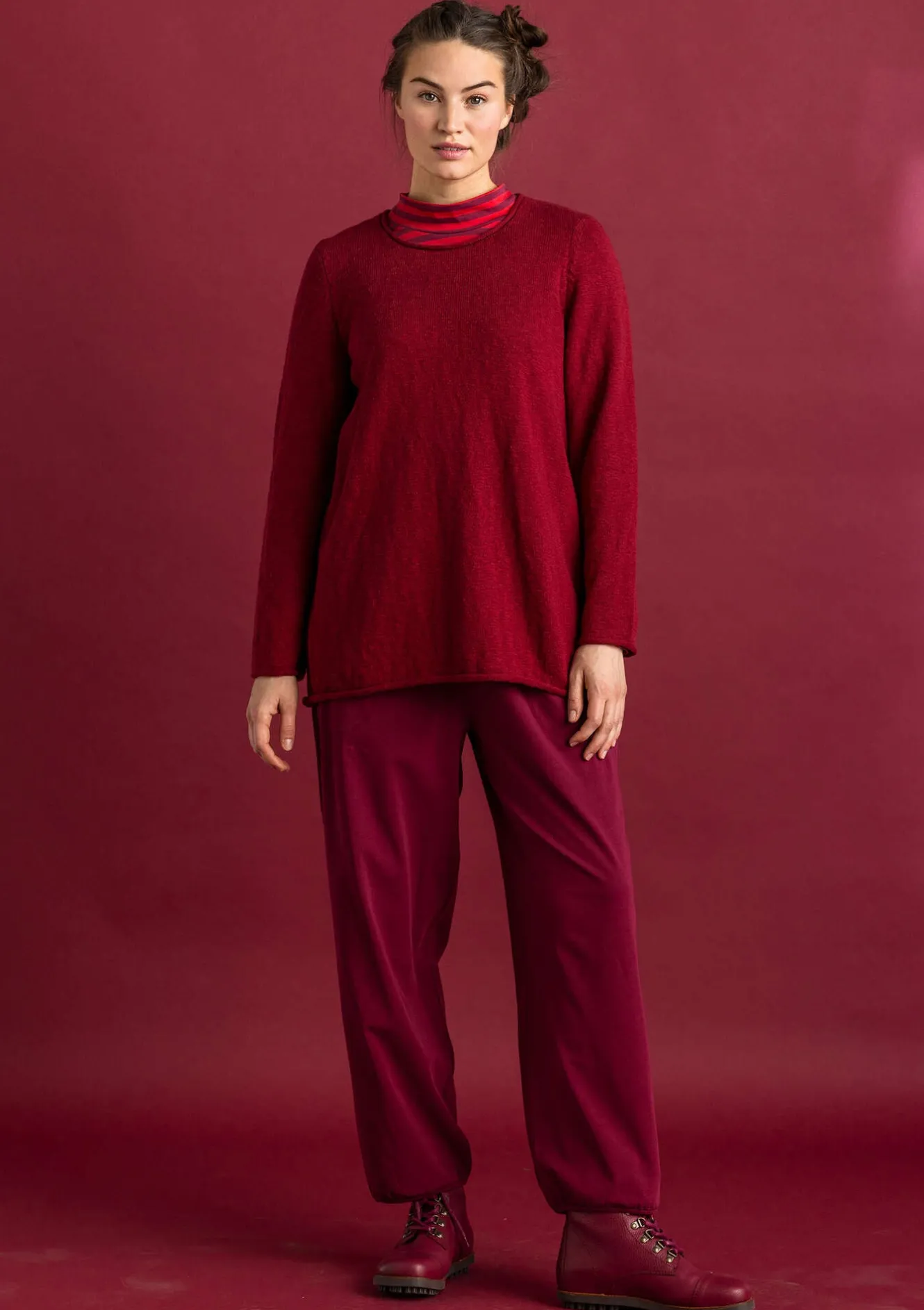 Stickad i ett fint slubgarn. Det ger ytan en mer oregelbunden känsla – som vi tycker mycket om. Finns i både enfärgat och med en rand. Hals, ärm och nederkant avslutas med rullkanter.