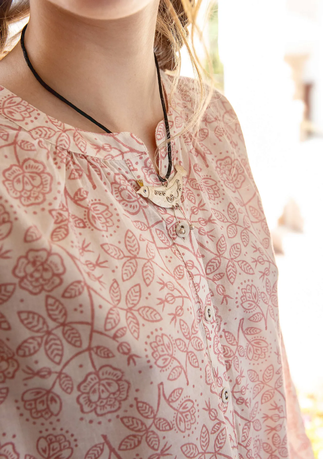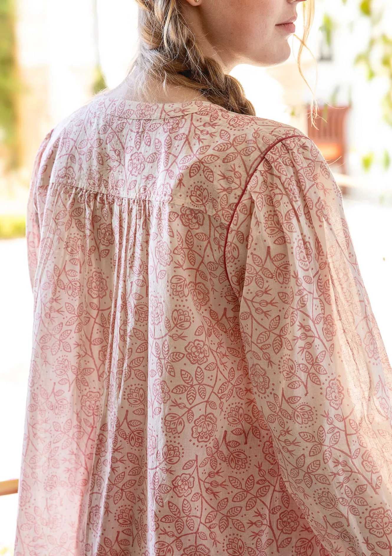 Blocktryckt blus med sirliga nyponrosor. Modell som är rundad i nederkant och har en knäppslå upptill som avslutas med ett motveck, vilket ger plagget extra vidd. Farfarskrage, klädda knappar och ett ok på bakstycket. Hellång puffärm med en passpoalkant längs axelsömmen.