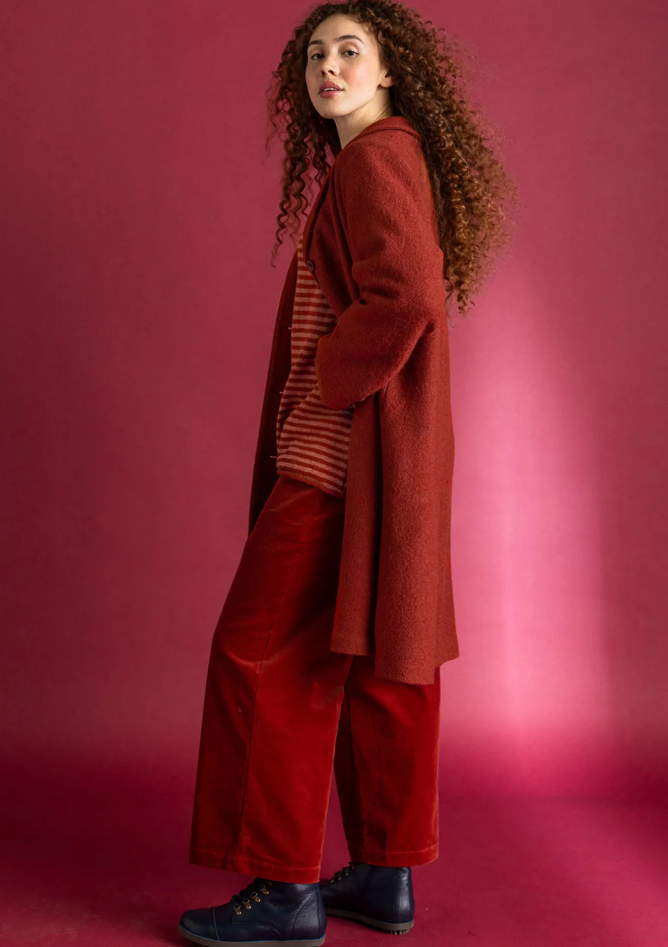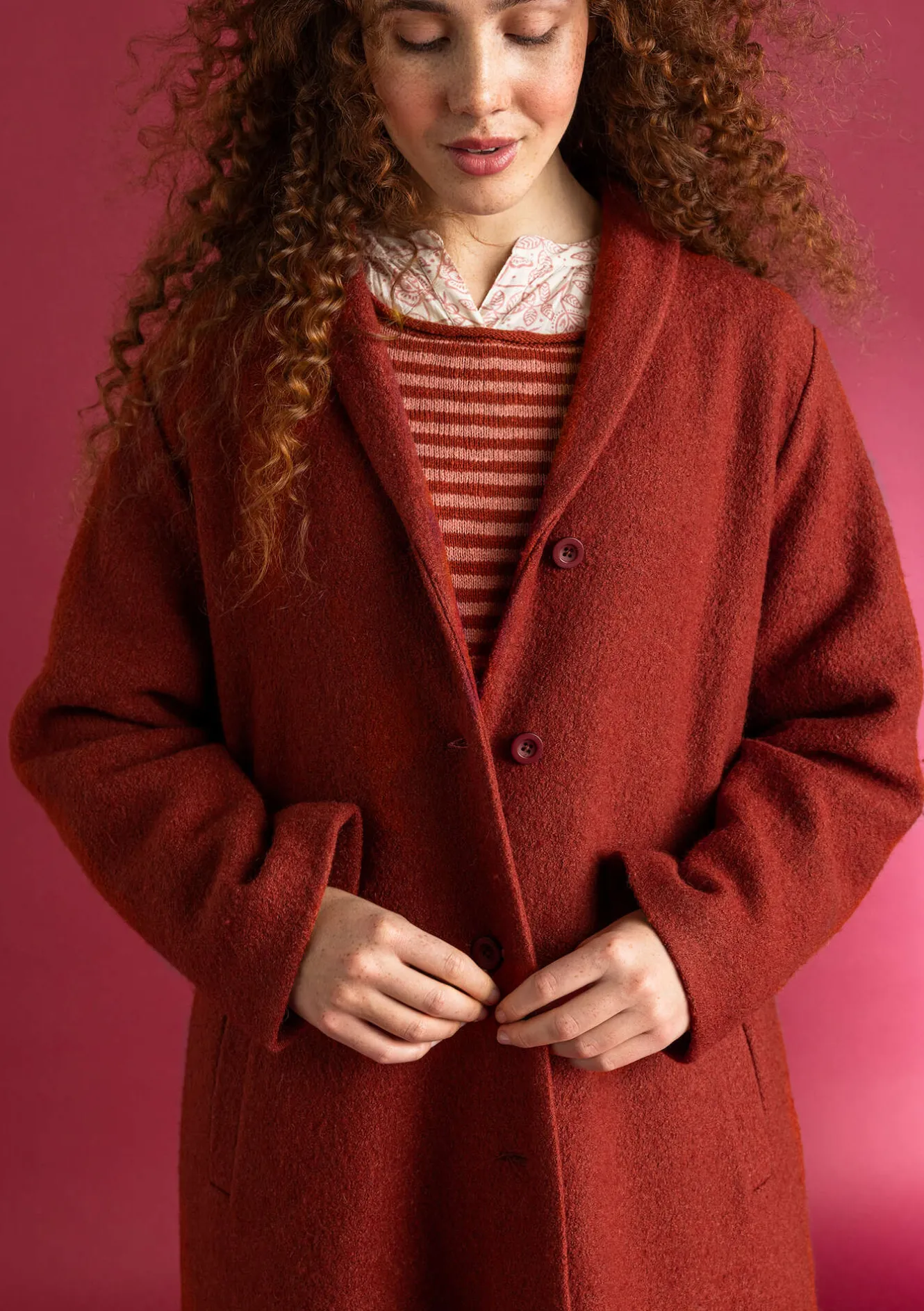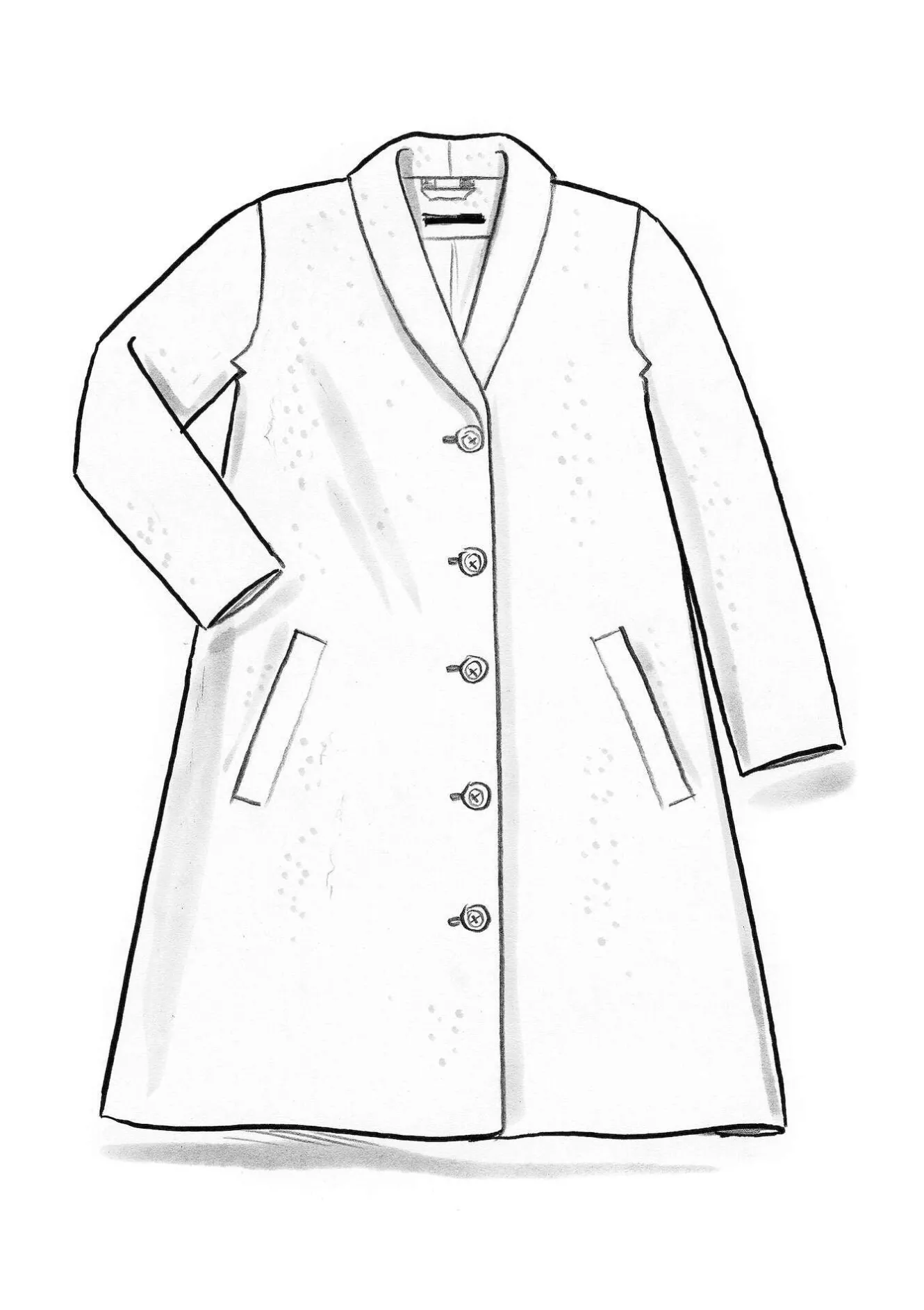 Halvfodrad kappa med nätt sjalkrage i ett bouclégarn som ger en fin ojämnhet som ger ytan liv. Enfärgad med praktiska fickor.