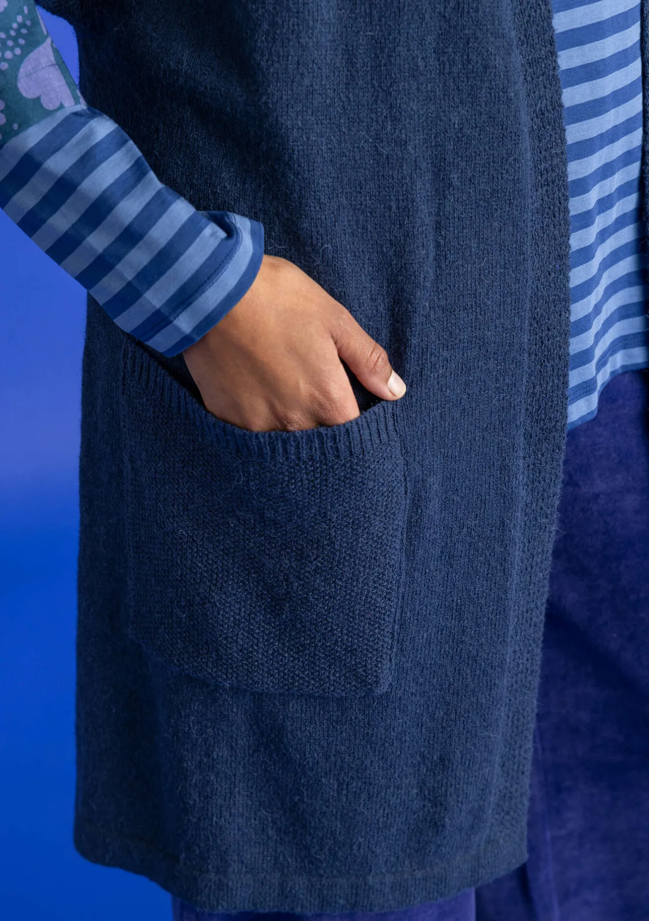 En längre, mysig och lös modell med skärp i midjan. En kort, vid raglanärm. Utanpå-fickor med en mosstickad struktur. Accentfärgade detaljer i nacken samt på insidan av ärmarna och nederkanten.