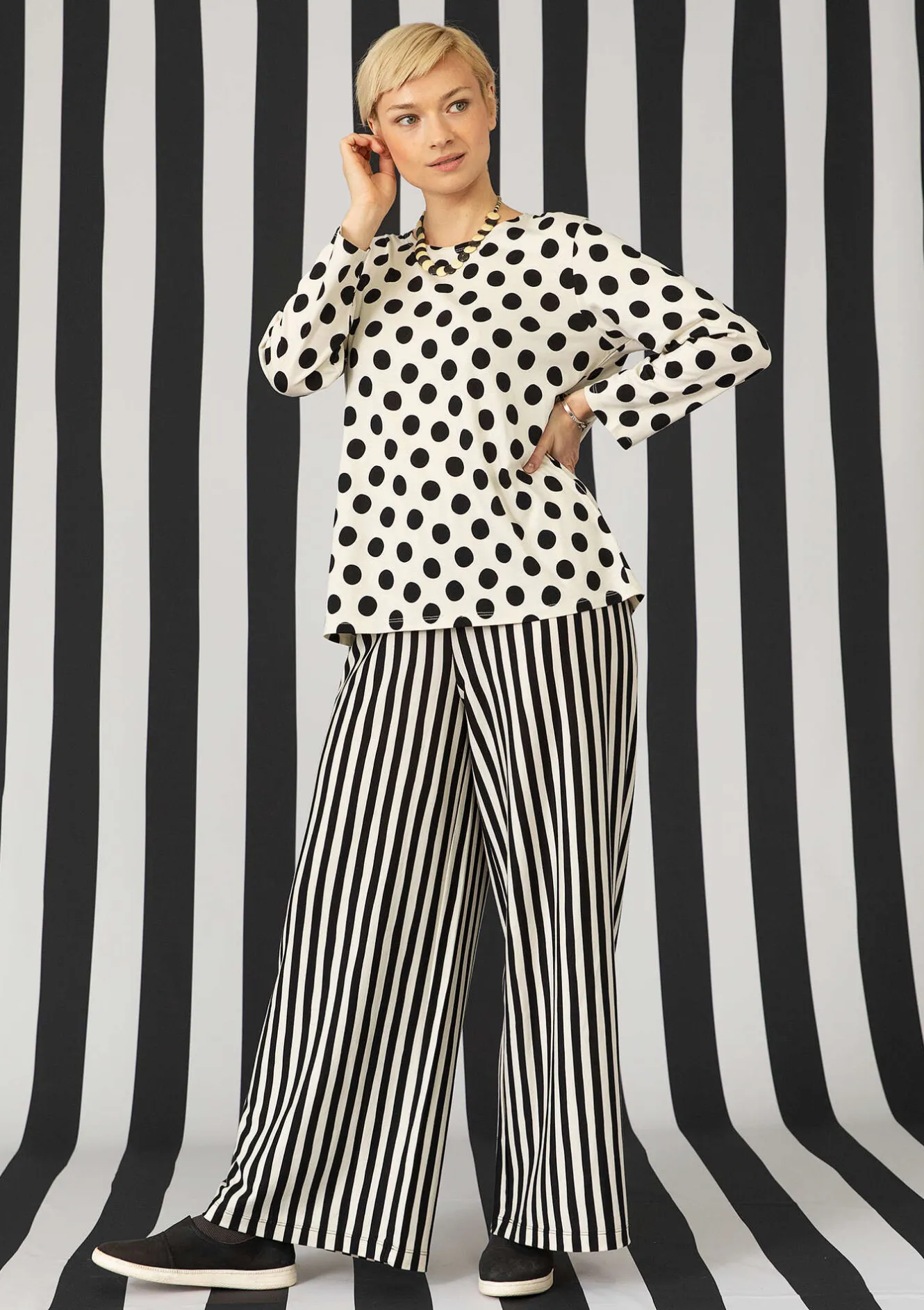 Hellång trikåbyxa med härlig vidd i benen och bekväm resår i midjan. Långrandig då vi vänt på tygriktningen.