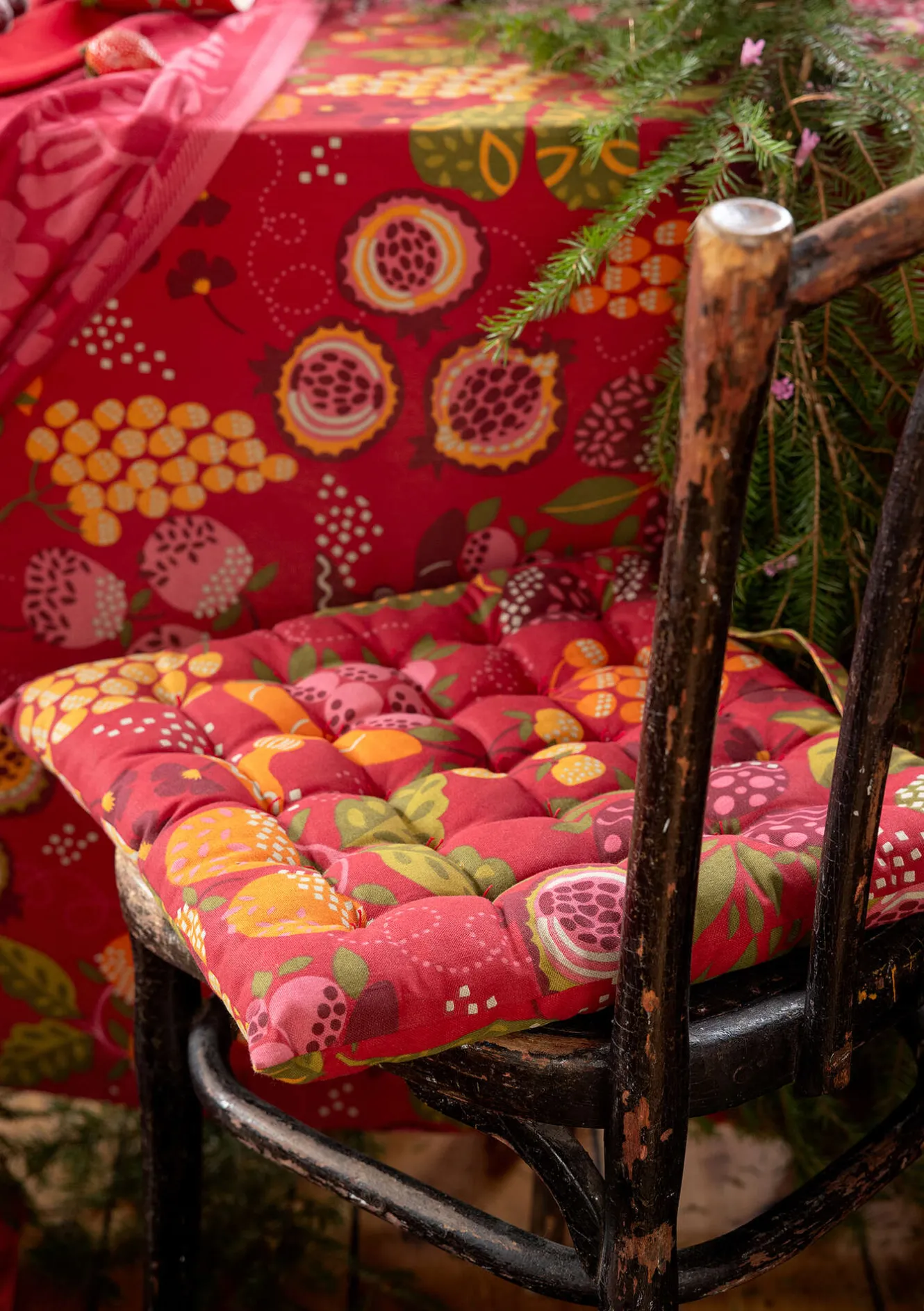 Sitt bekvämt på vår sittdyna tryckt med det färgsprakande fruktmönstret. Kvadratisk modell med stoppning och kviltade stygn samt handtag för upphängning.