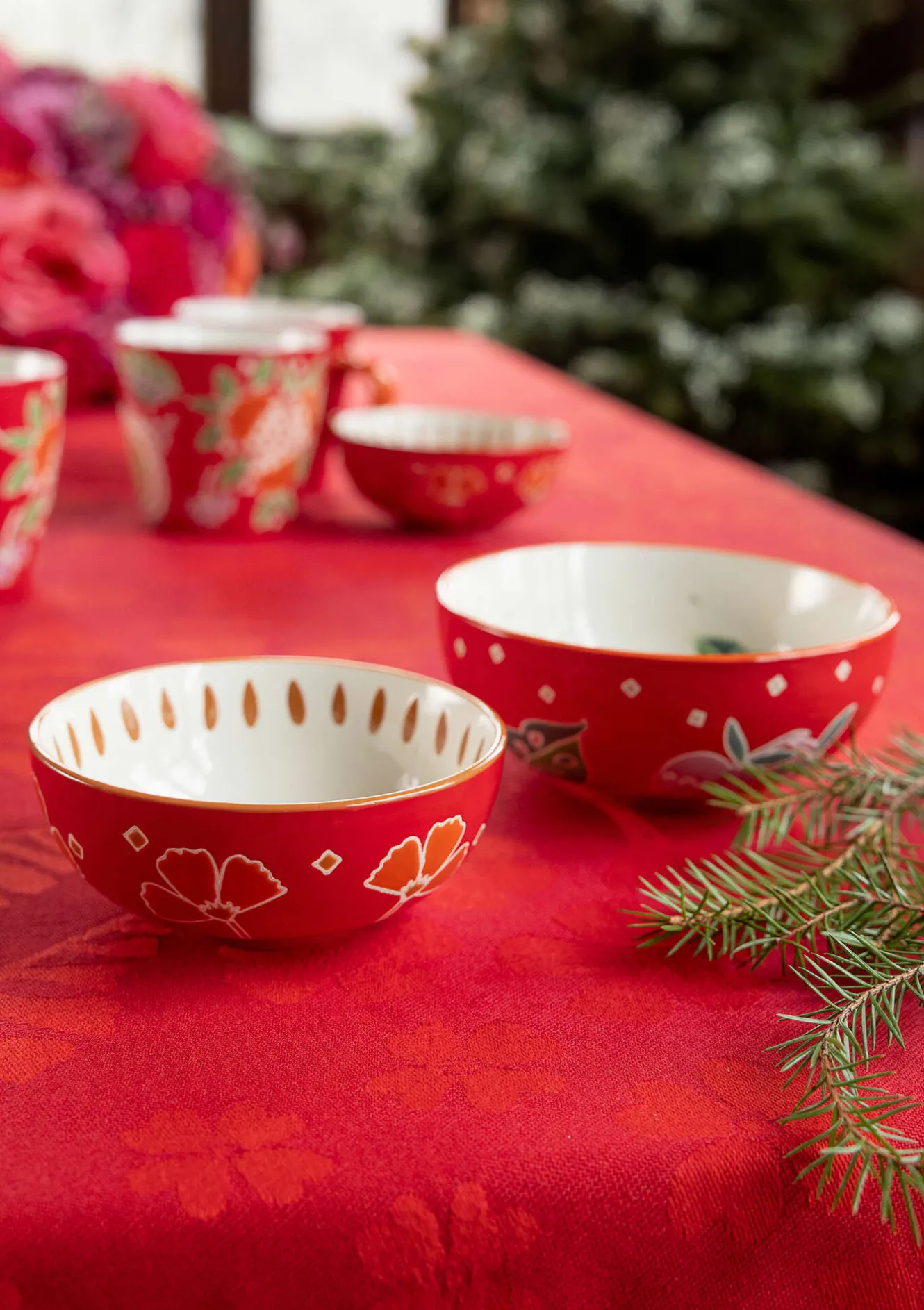Två underbara skålar i keramik dekorerade med handmålade frukter och blad i härliga färger. Säljs i 2-pack där den ena skålen är lite mindre och passar att stapla i den större.