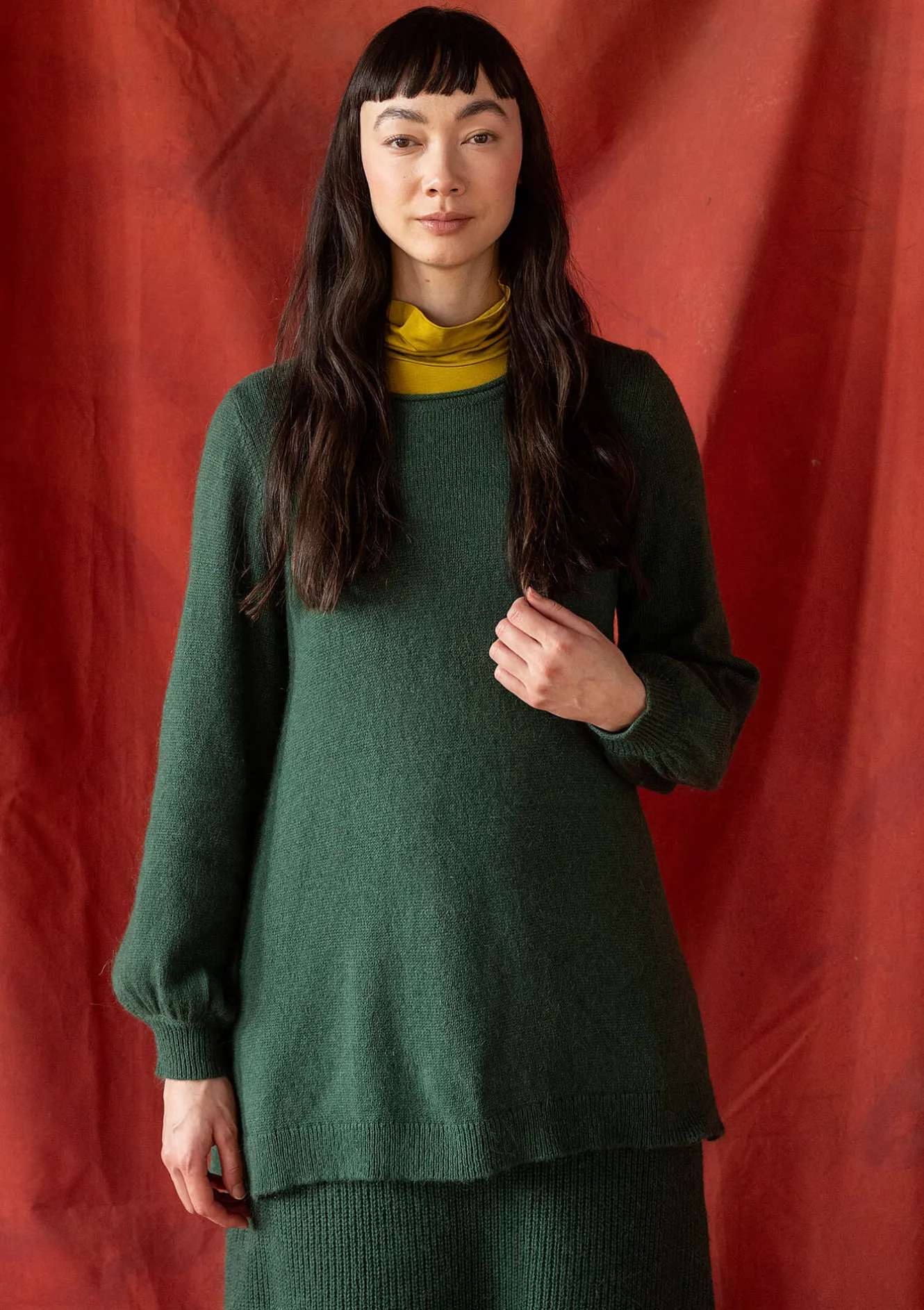 Slätstickad tunika i mjuk alpackamix med sidslitsar. Helång ärm med puff nedtill och rund halsringning med rullkant. Ribbstickad vid ärmslut och i nederkant.