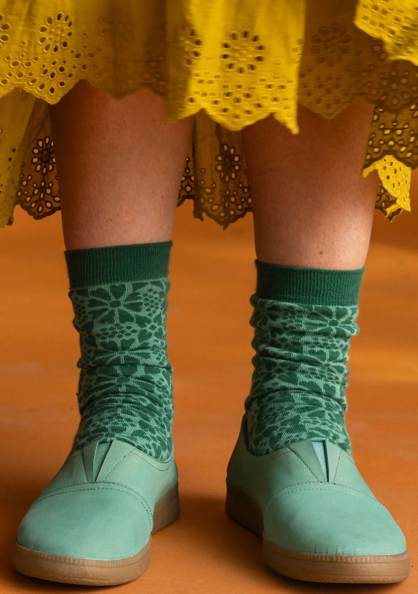 Grafiskt folkloristiska blomster pryder denna lilla strumpa. Bekväm och mjuk ribb upptill.