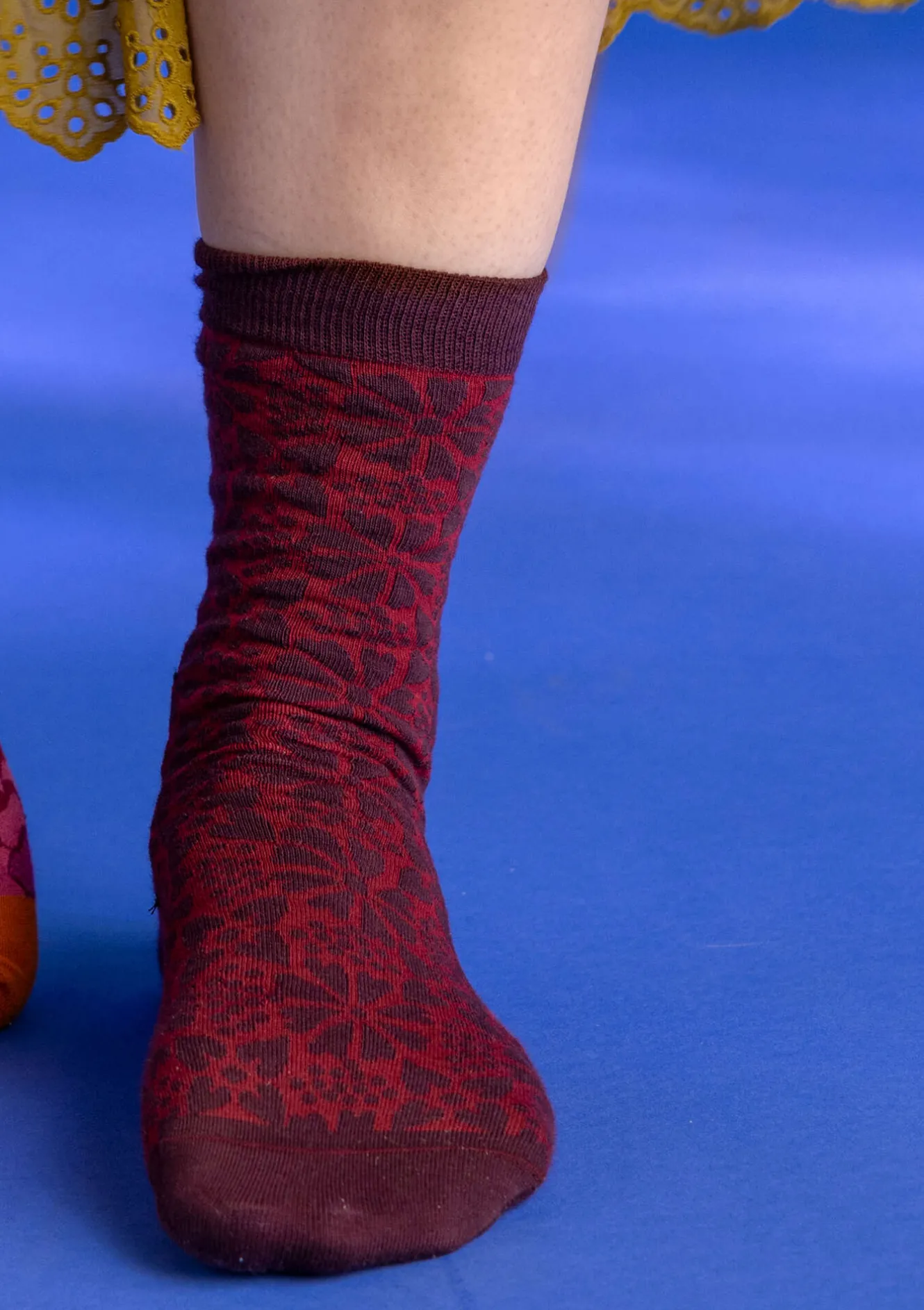 Grafiskt folkloristiska blomster pryder denna lilla strumpa. Bekväm och mjuk ribb upptill.