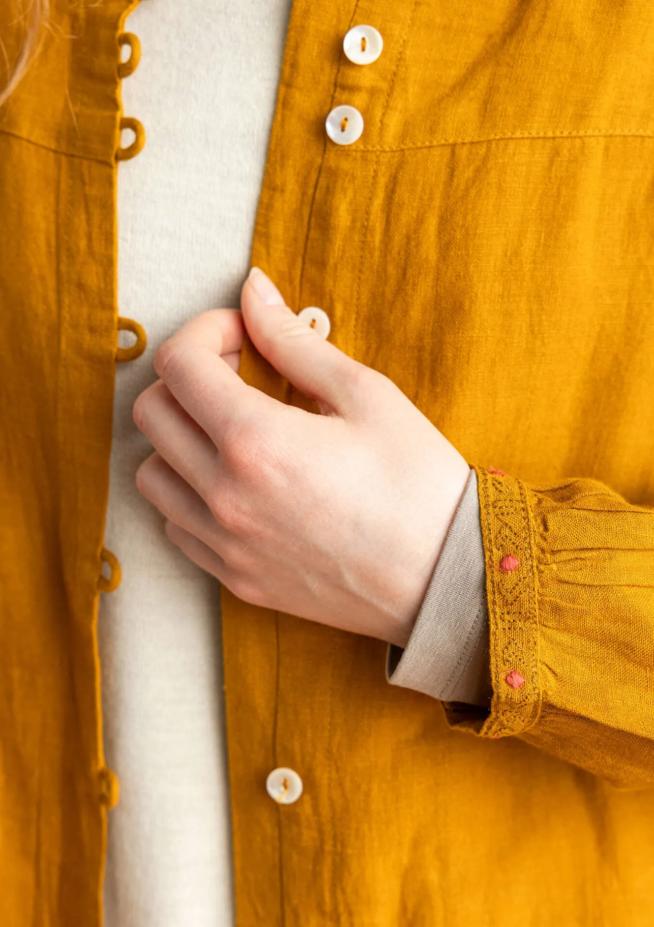 Genomknäppt blus, med utan-på-fickor. Finns som både i enfärgad och med en vävrand. Ok fram och bak. Hellång ärm med broderidetalj. Knäpps med pärlemorknappar och öglor. Slitsar i sidorna.