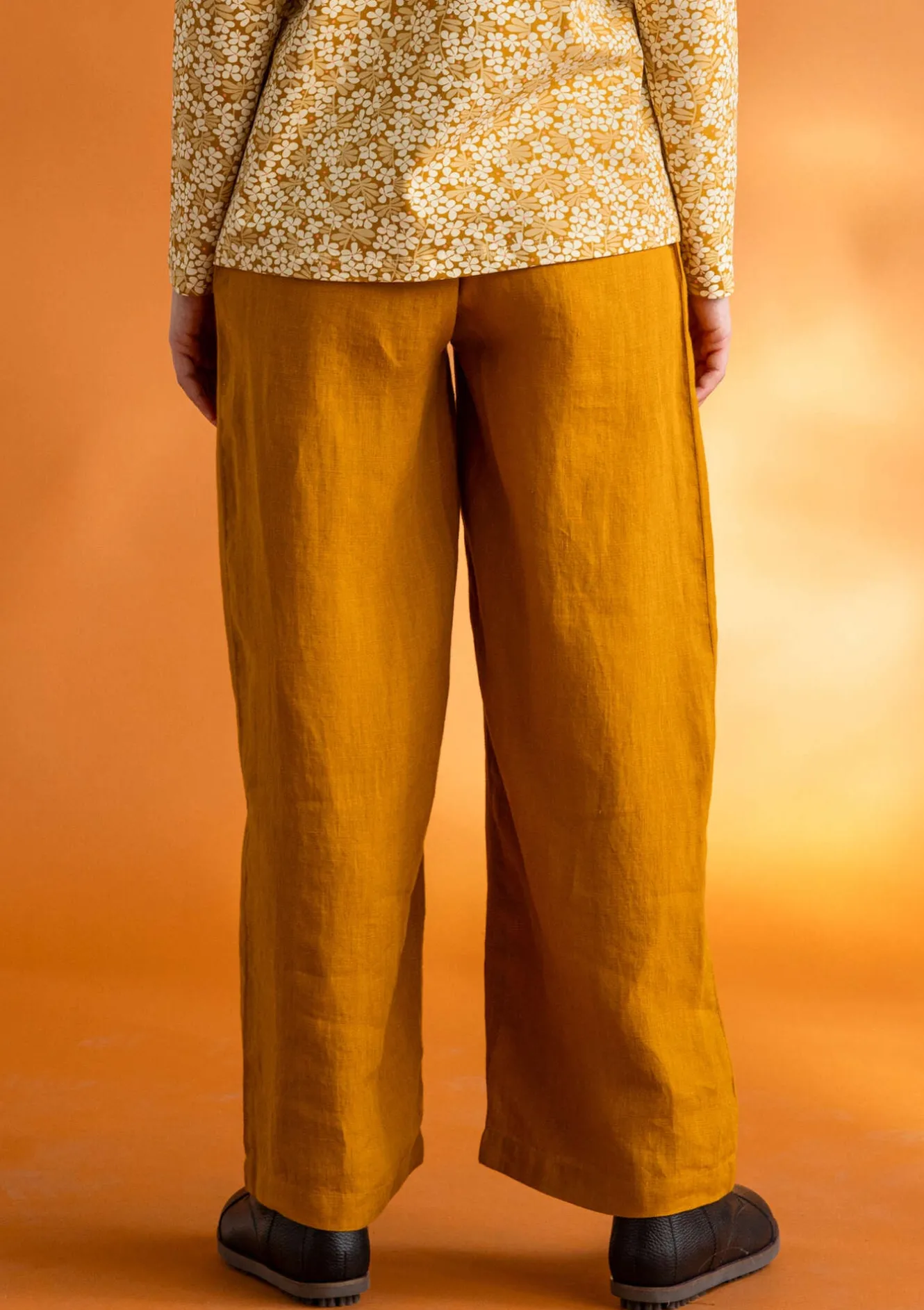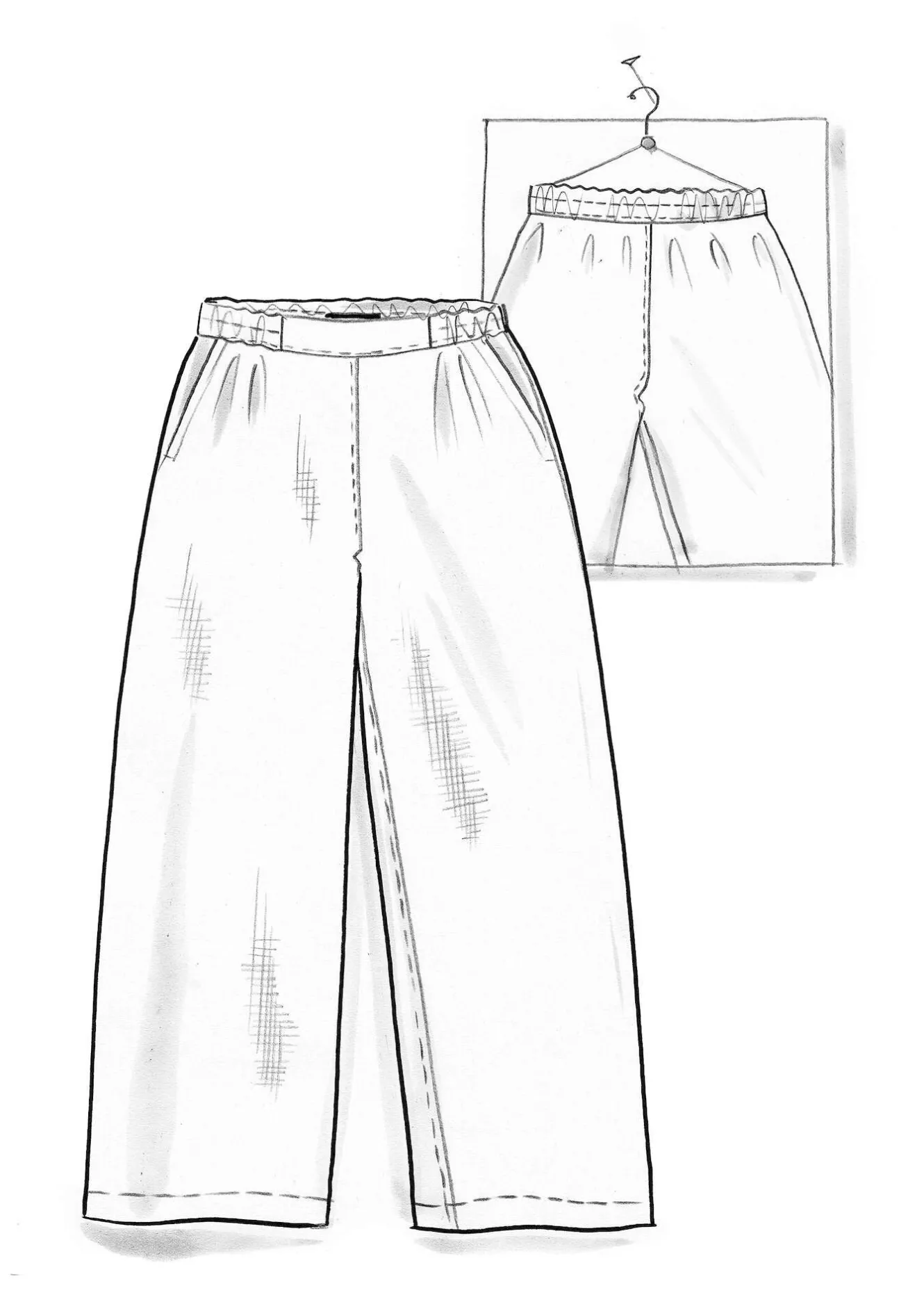 Byxa i linnetyg, med snyggt fall. Finns i enfärgat och med en garnfärgad rand. Hellång modell, med enkel resår i midjan. Raka, vida byxben och praktiska sidfickor.