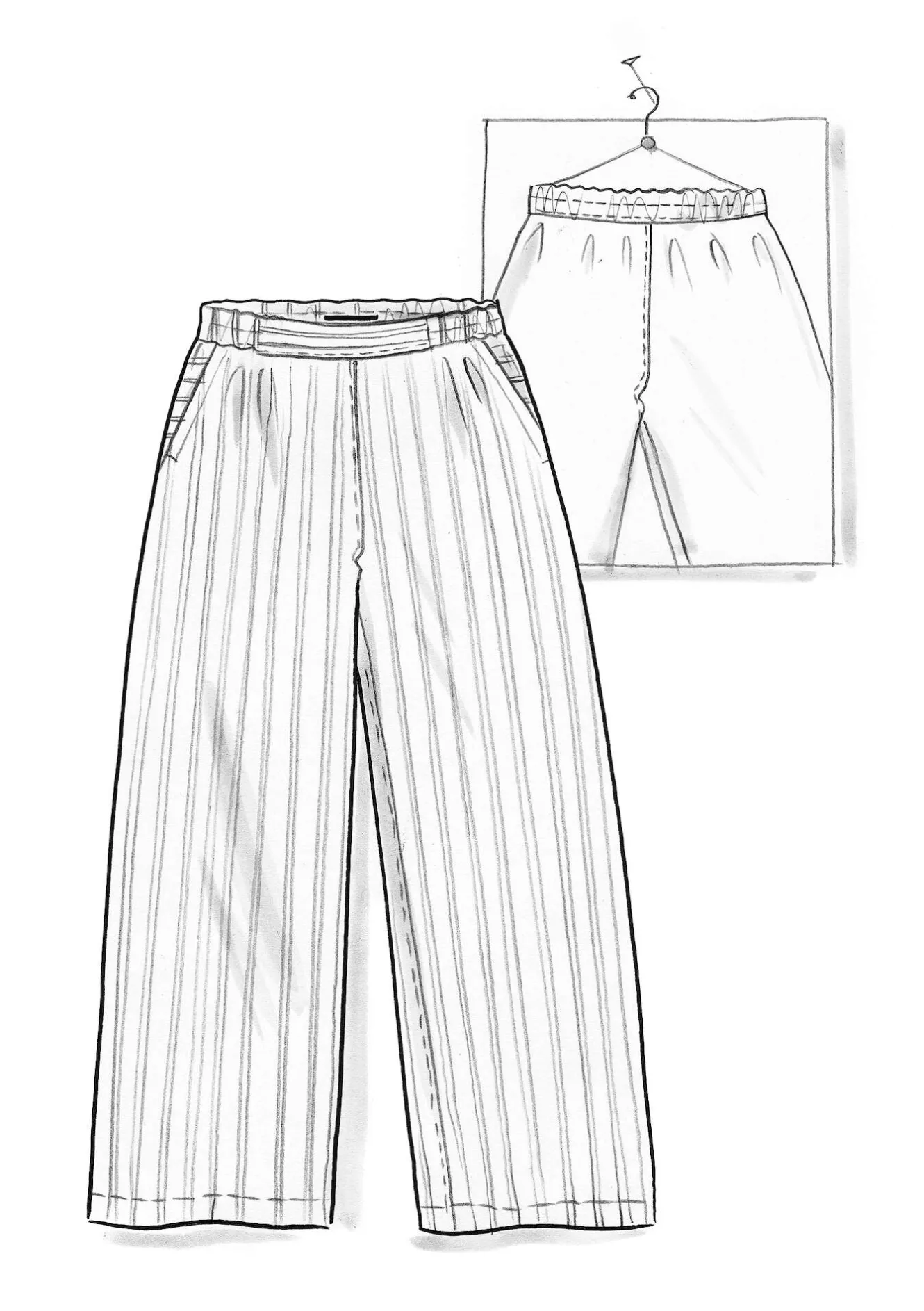 Byxa i linnetyg, med snyggt fall. Finns i enfärgat och med en garnfärgad rand. Hellång modell, med enkel resår i midjan. Raka, vida byxben och praktiska sidfickor.
