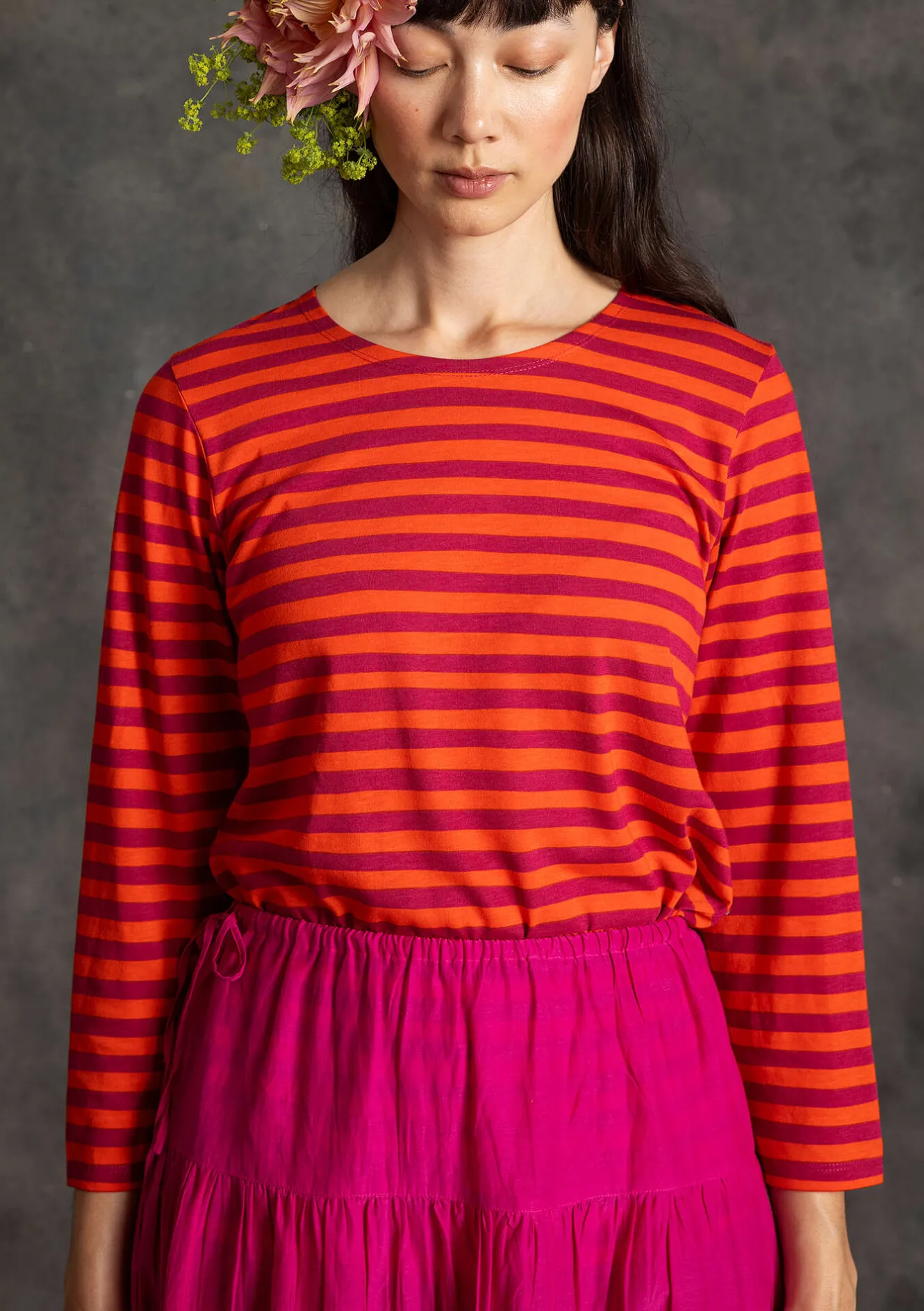 Kjol i härlig siden/bomullsväv med fint fall och mycket vidd. Fin modell sydd i fyra våder, dragsko samt bekväm resår i midjan.