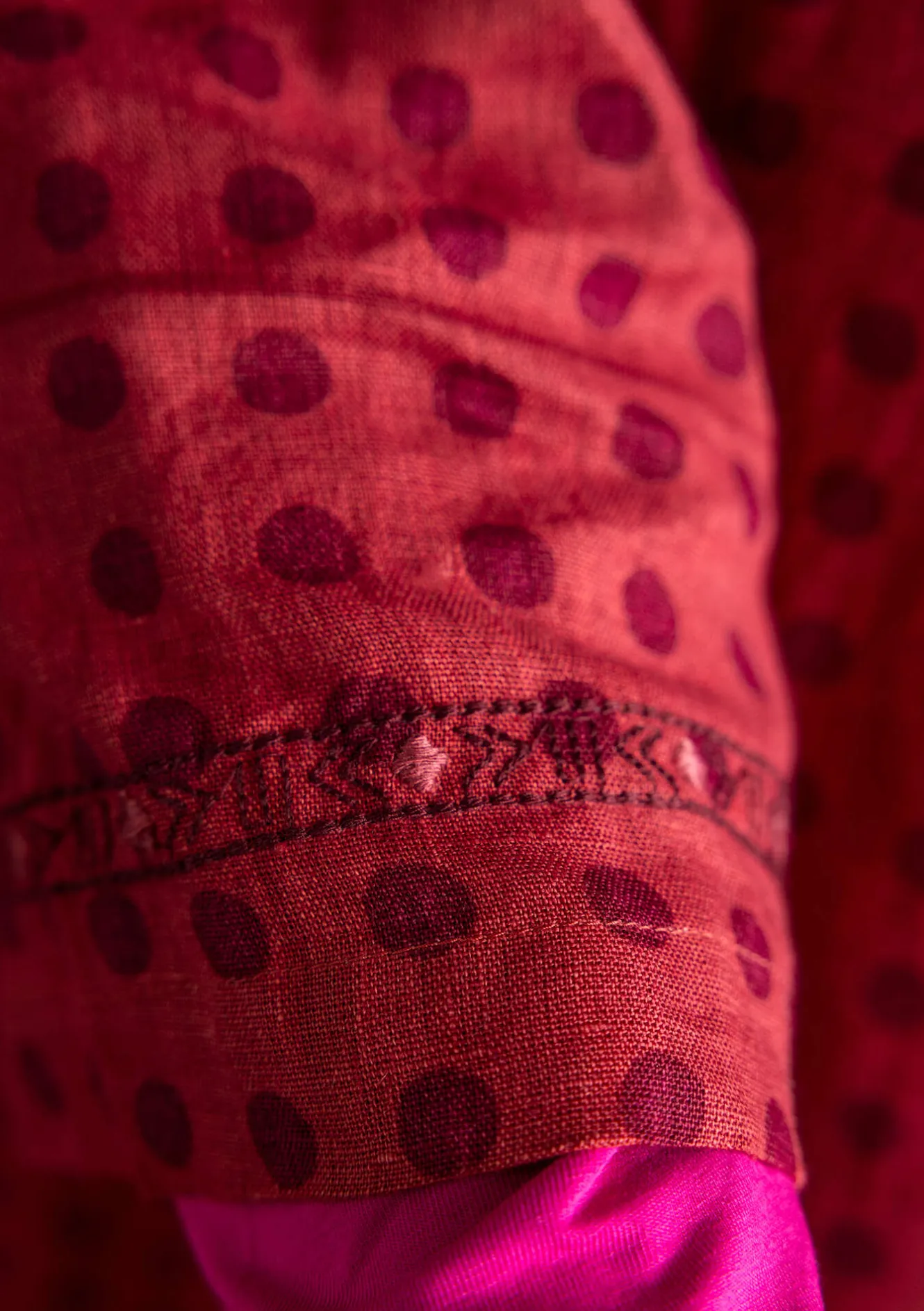 Modell med V-ringat ok både fram och bak. Knäppdetalj framtill samt ett litet veck för lite extra vidd. Trekvartslång ärm med broderidetalj i dess nederkant. Dolda fickor i sidorna.