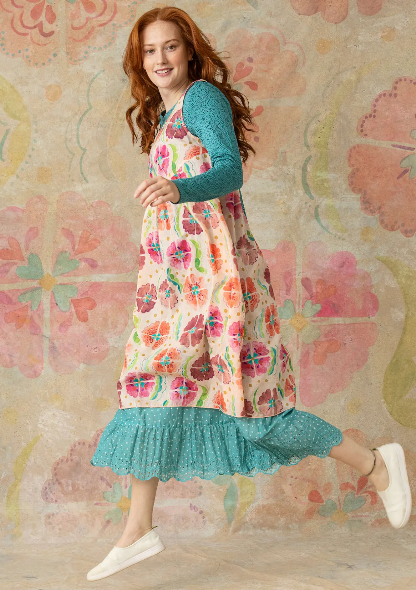 Ärmlös klänning med sidfickor samt ett ok med rynkning på både fram- och bakstycke. Alla färgställningar har olika digitaltryckta mönster med akvarellmålade blommor.