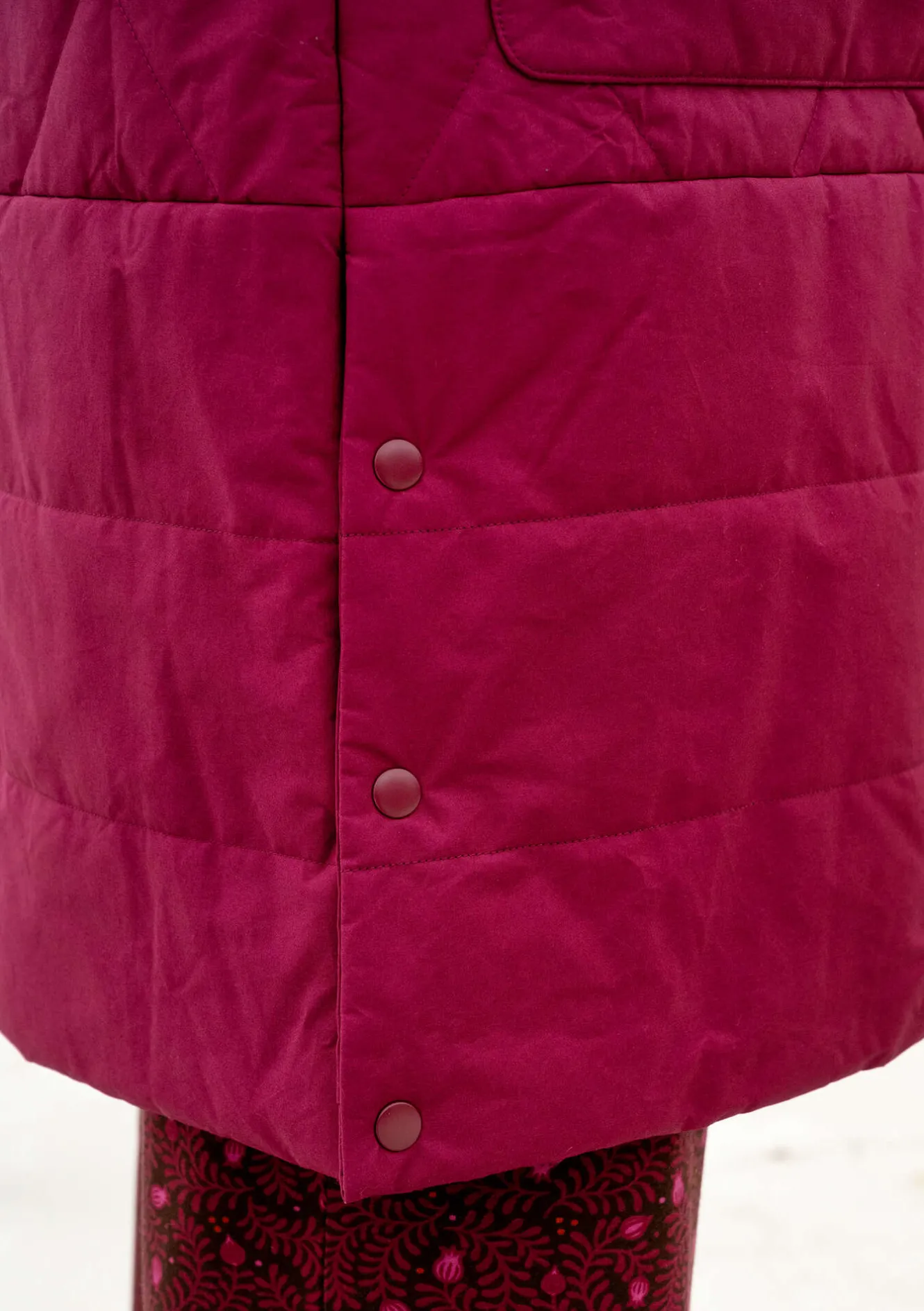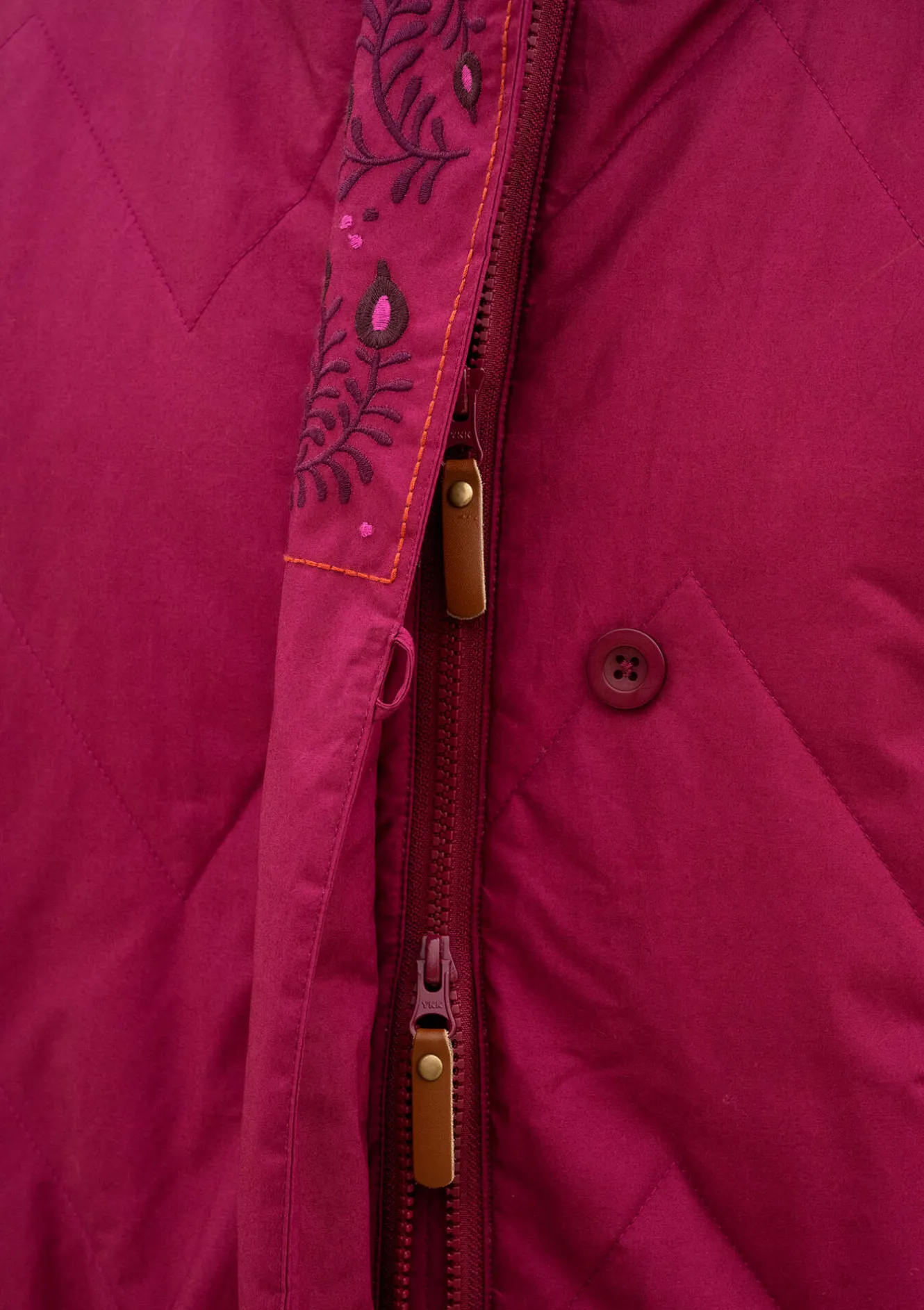 Kviltad, helfodrad kappa i en modell med hellång ärm och sidslitsar som kan knäppas igen med tryckknappar. Dold dragkedja samt en knappslå mitt fram. Rymliga fickor och en dold mudd i ärmen. Dekorativa broderier vid ärmslut, hals och runt huva.