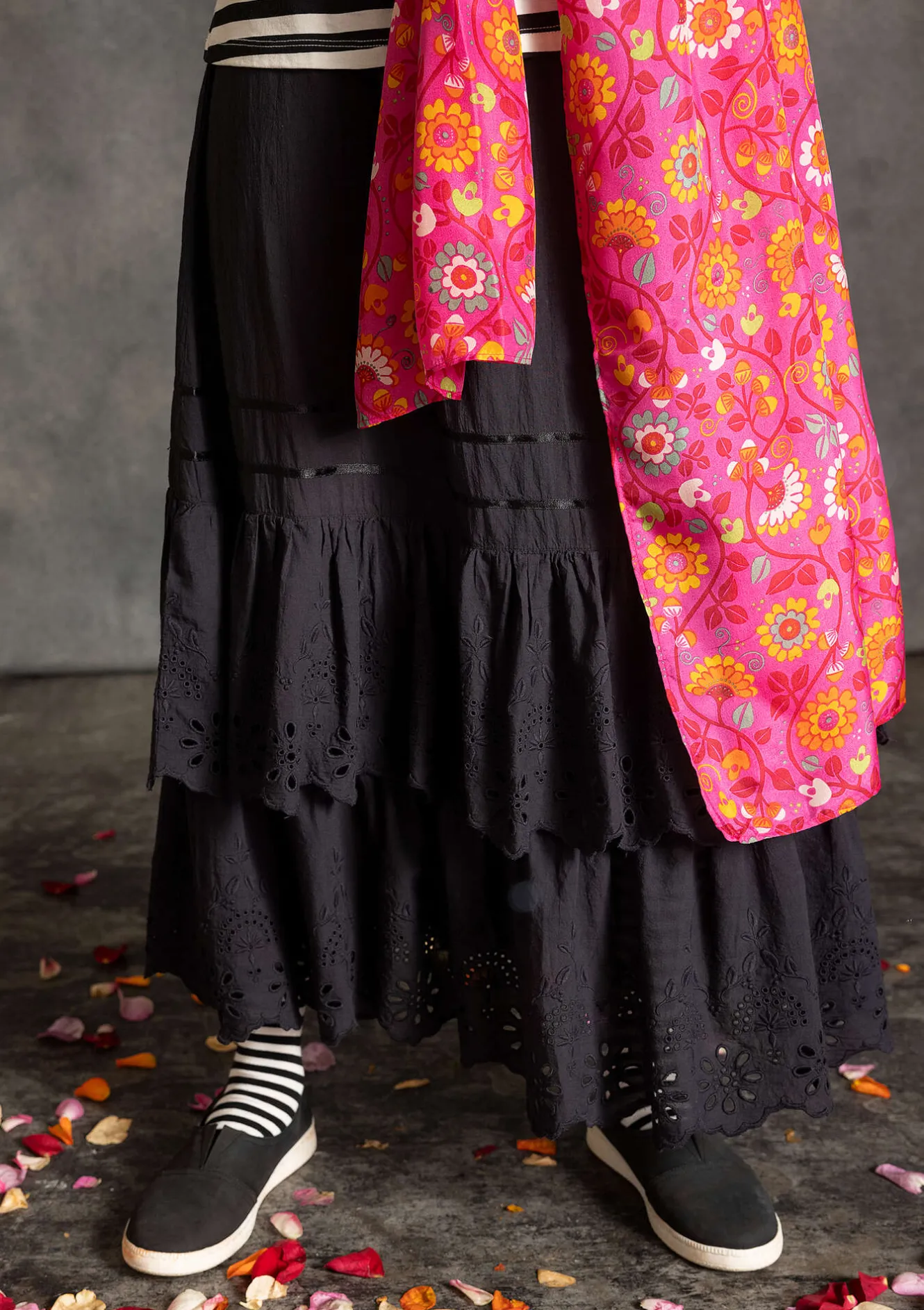 Utsmyckad kjol, fin att bäras som den är eller som en underkjol. Modell med två våder med hålbroderi som ligger i lager på varandra.Två rader av satinband sydda ovanför våderna. Resår i midjan samt dragsko.
