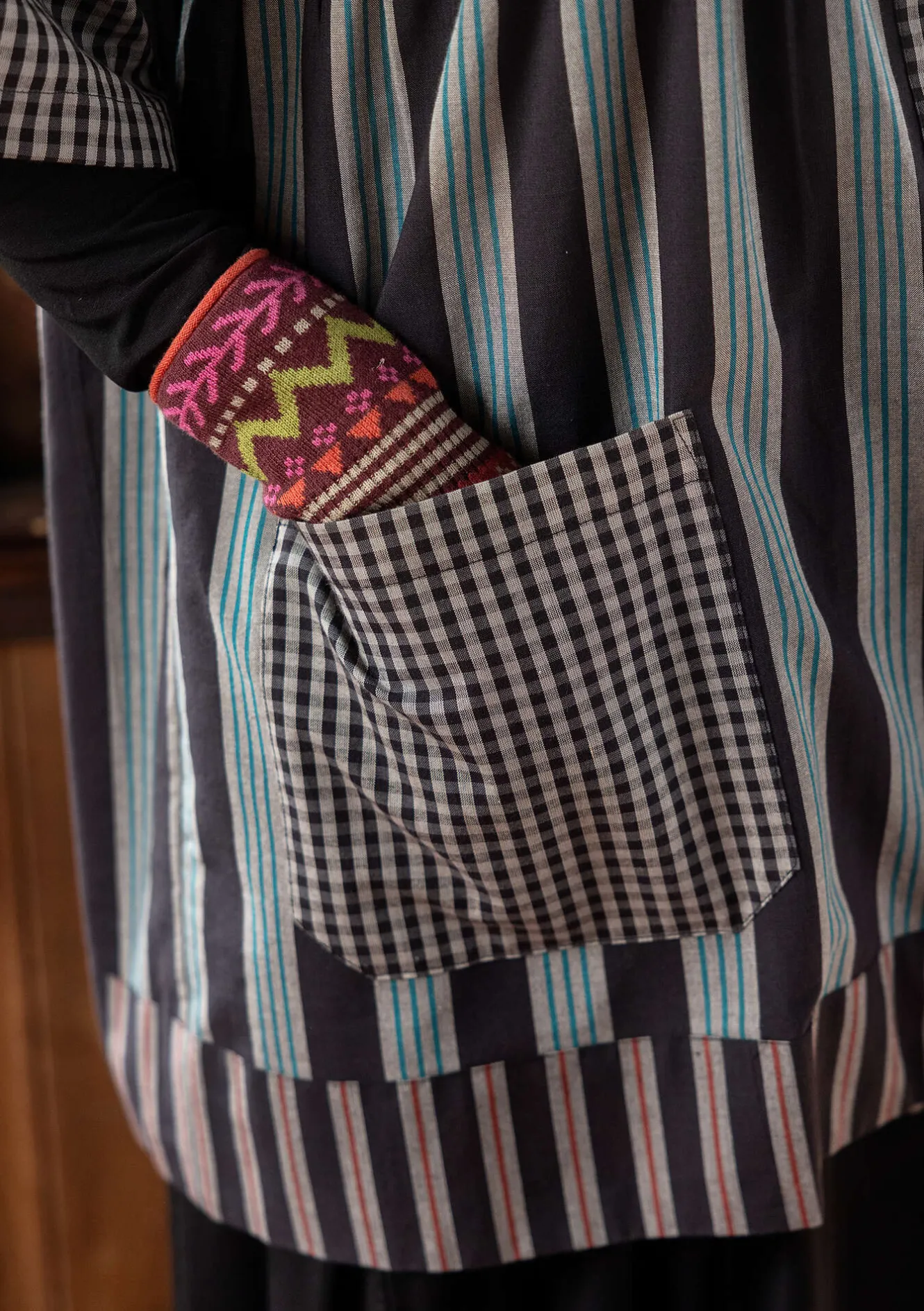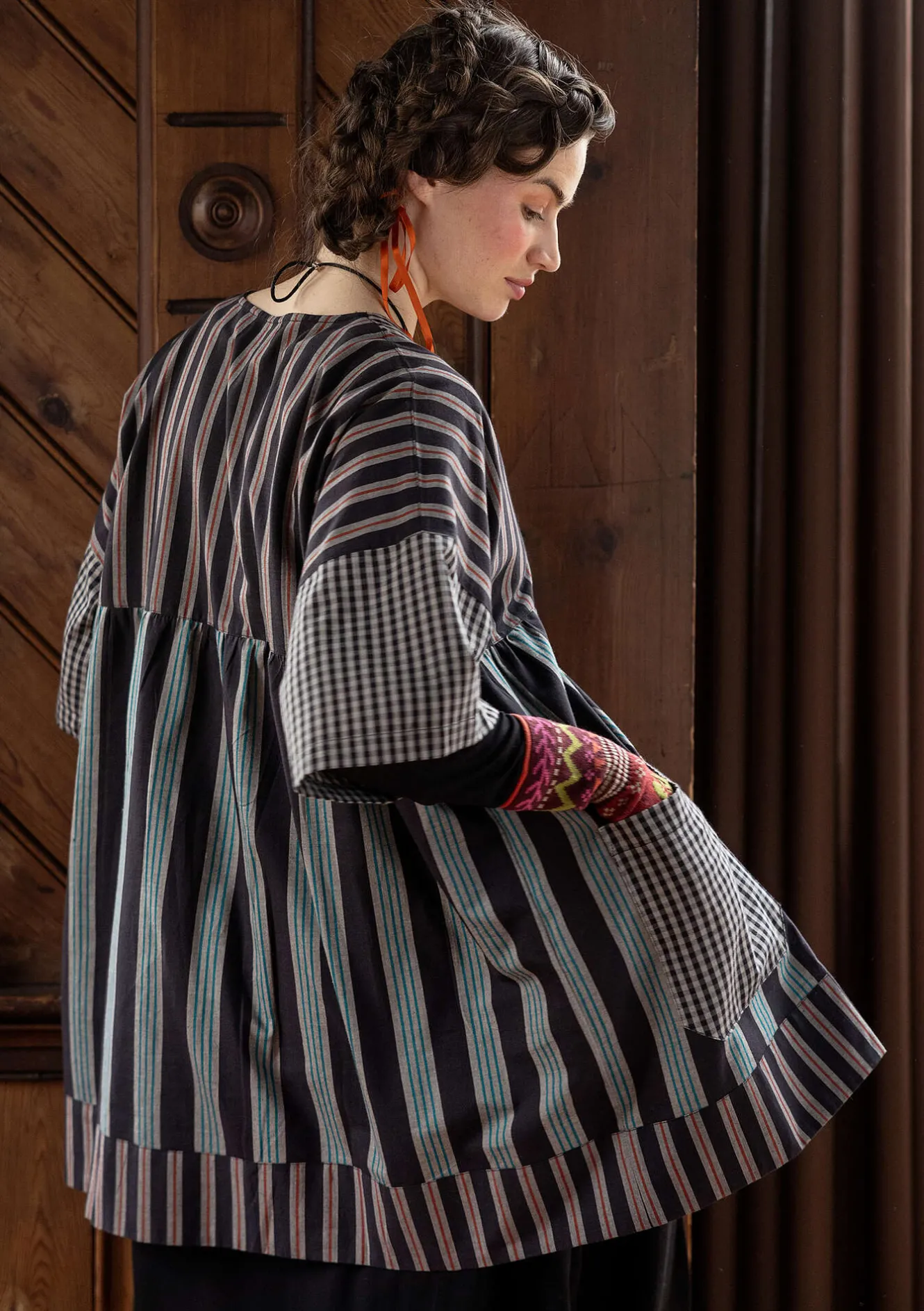 Genomknäppt artistblus med partier i olika vävränder och en garnfärgad ruta. Modell med avskuren midja och rynkning på både fram- och bakstycke. V-ringad hals och en armbågslång ärm med nedhasad axel. Tygklädda knappar och en utanpåficka.