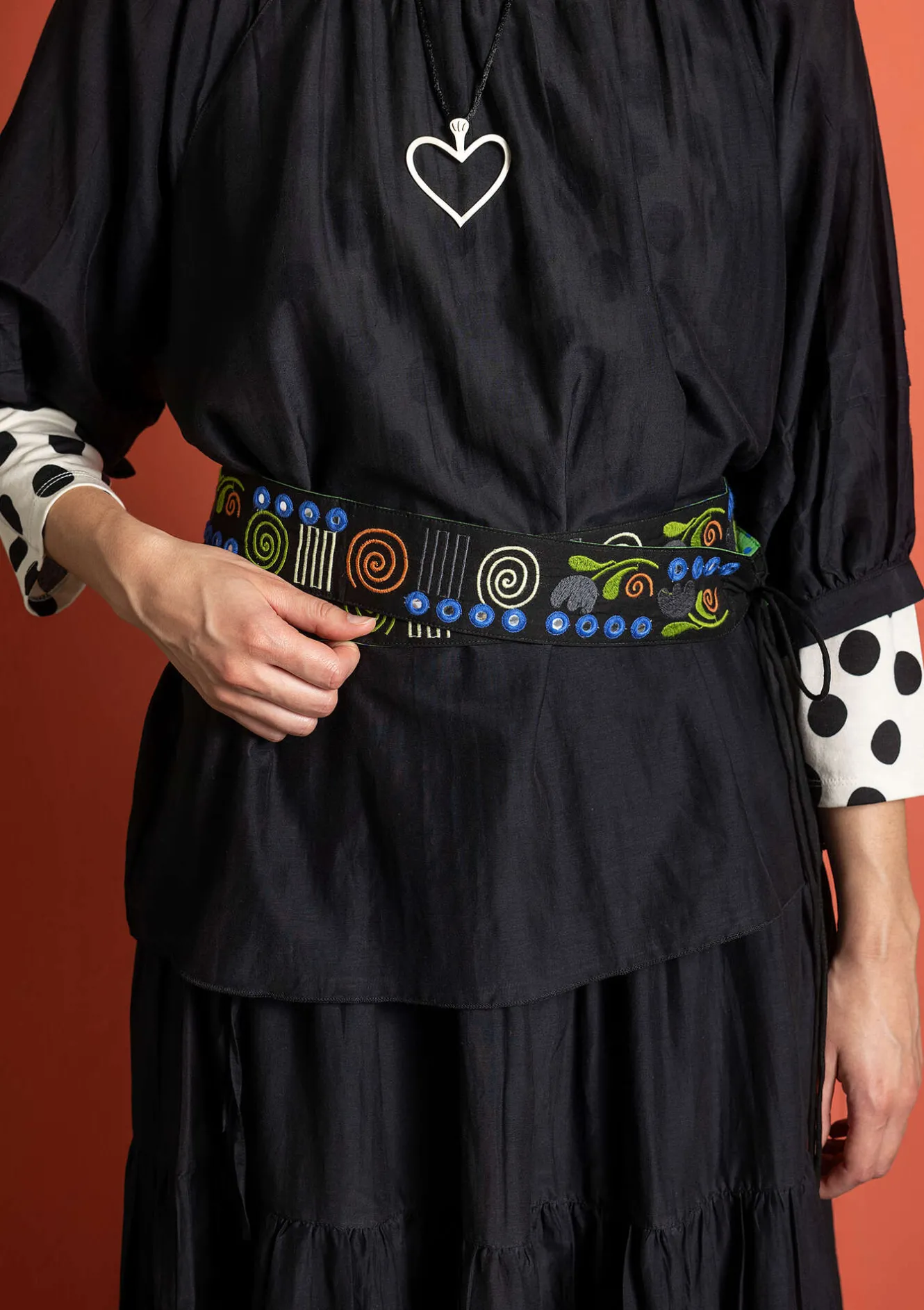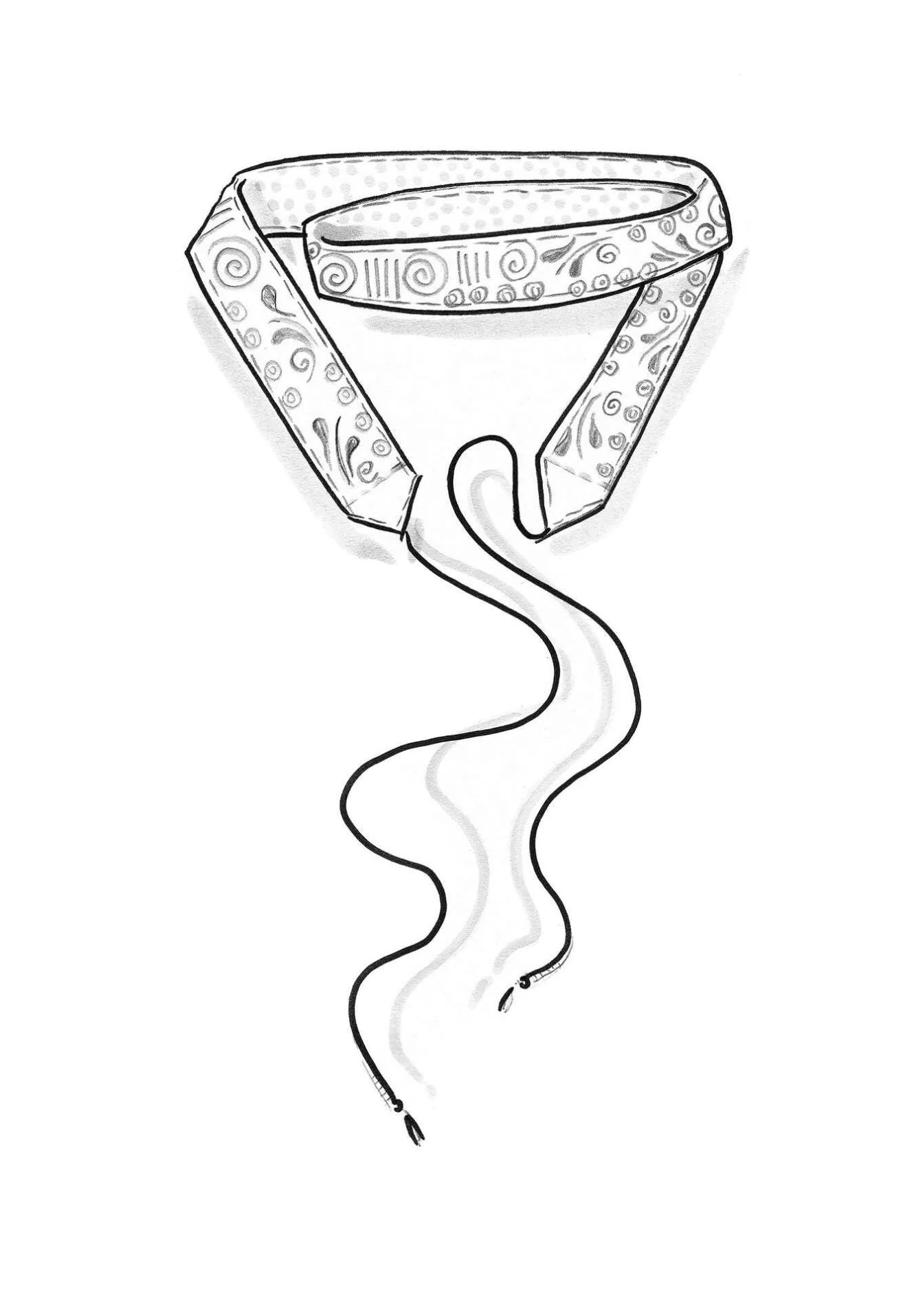 Rikt utsmyckat bälte med broderi och spegelbroderi. Fodrat med tryckt prickigt tyg. Rundsydda band för knyt i midjan, avslutas i ändarna med dekorativ tråd.