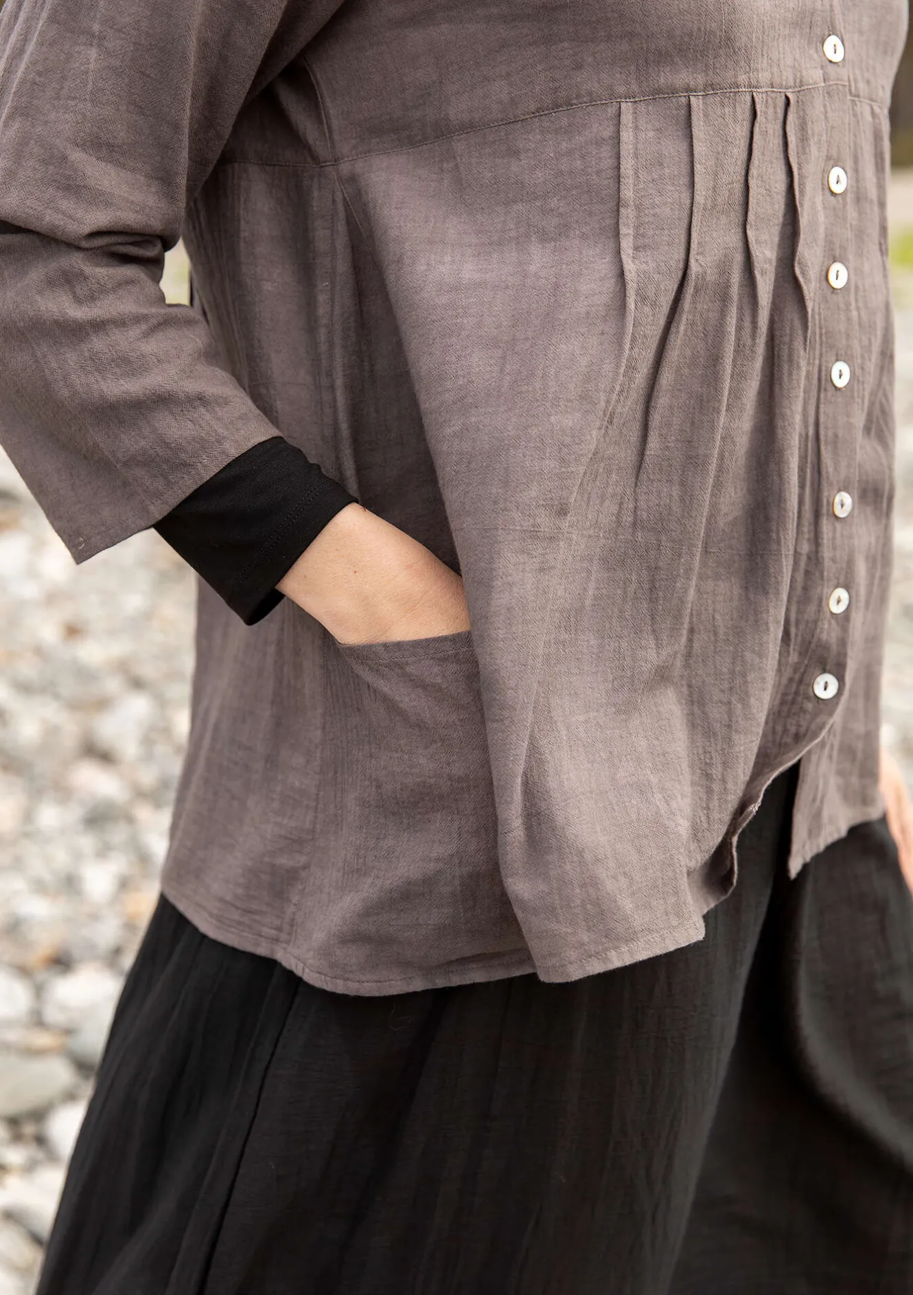 Genomknäppt blus som är färgad med växtfärger. Avskuren under bysten med stråveck både på fram- och baksidan. V-ringad hals, lite längre trekvartsärm samt fickor i sidorna.
