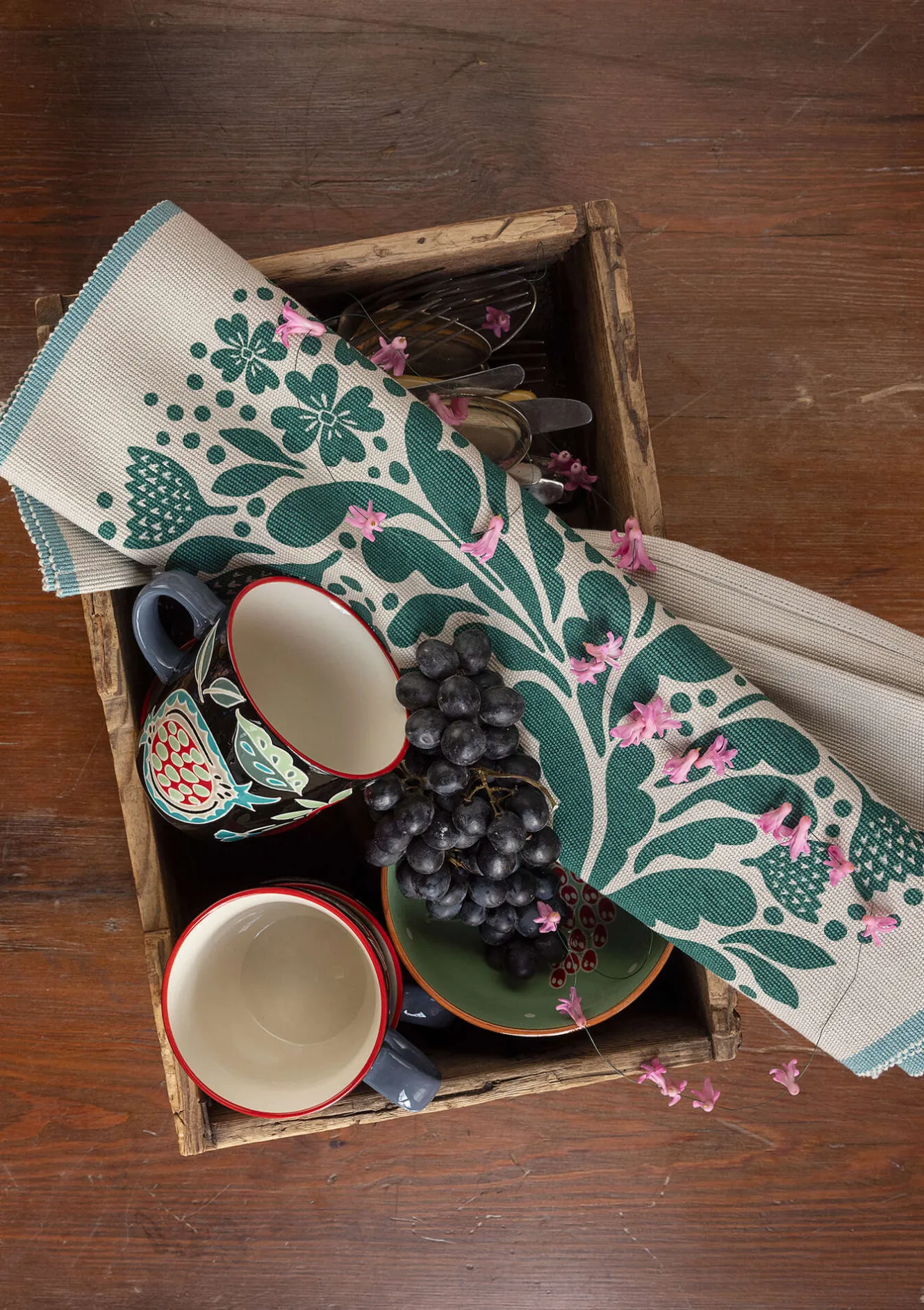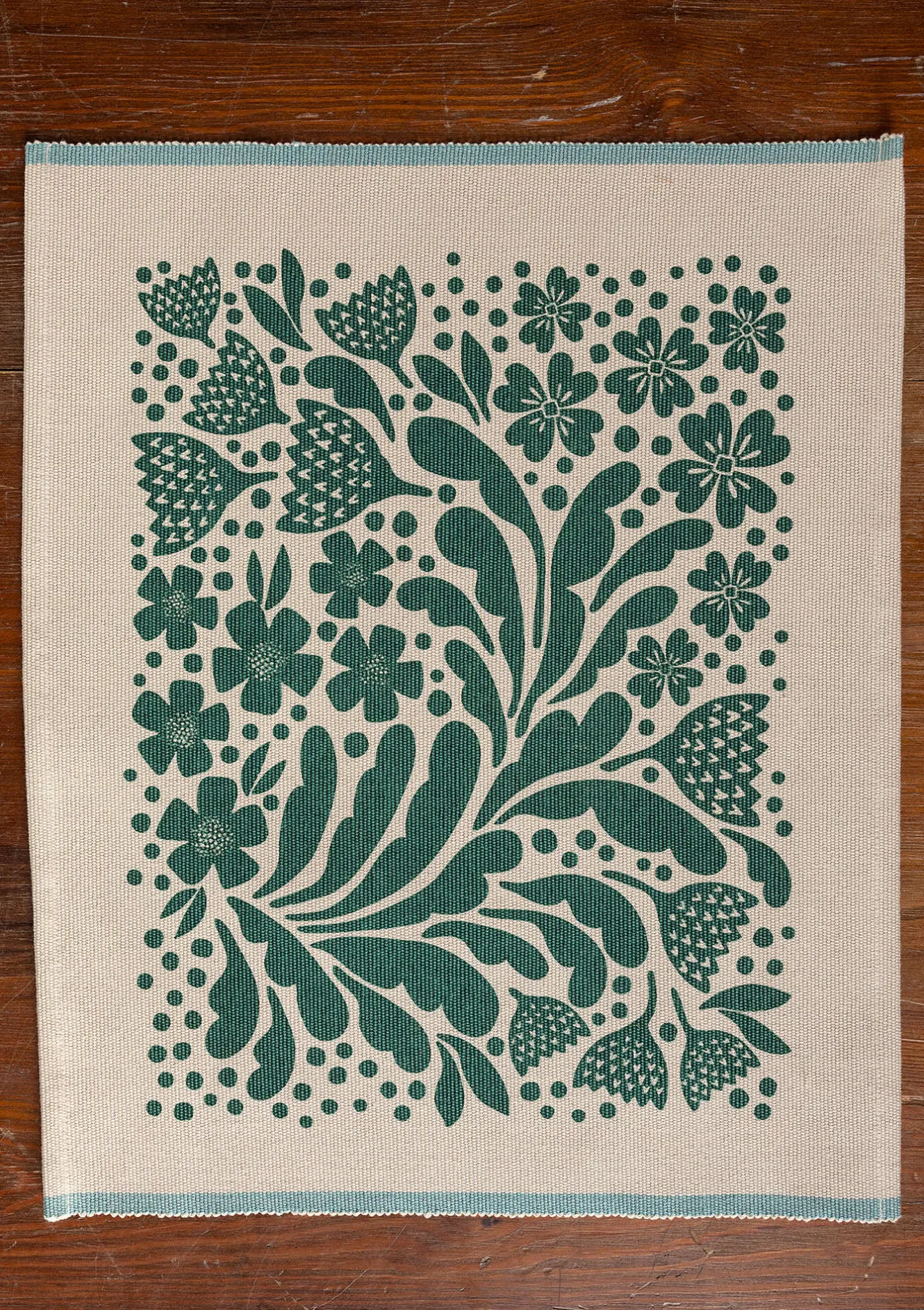 Bordstablett i tät ripsväv smyckad med tryckta blommor som frodigt breder ut sig. Vackert ackompanjerat med vävda kanter i accentfärg.
