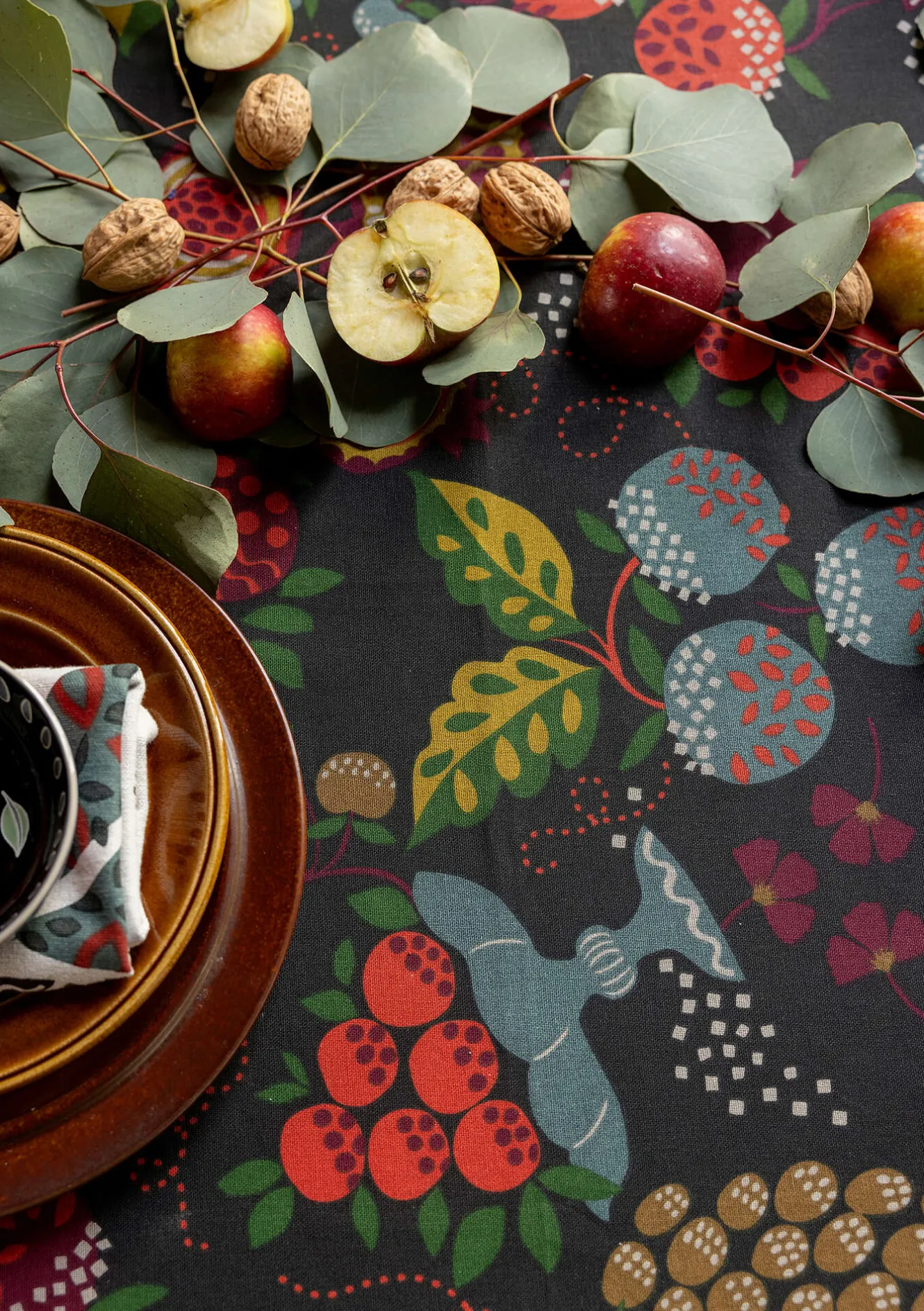 Det blir färgstarkt på bordet med vår duk som är mönstrad med kanderade frukter i vackra färger. Rektangulär modell.