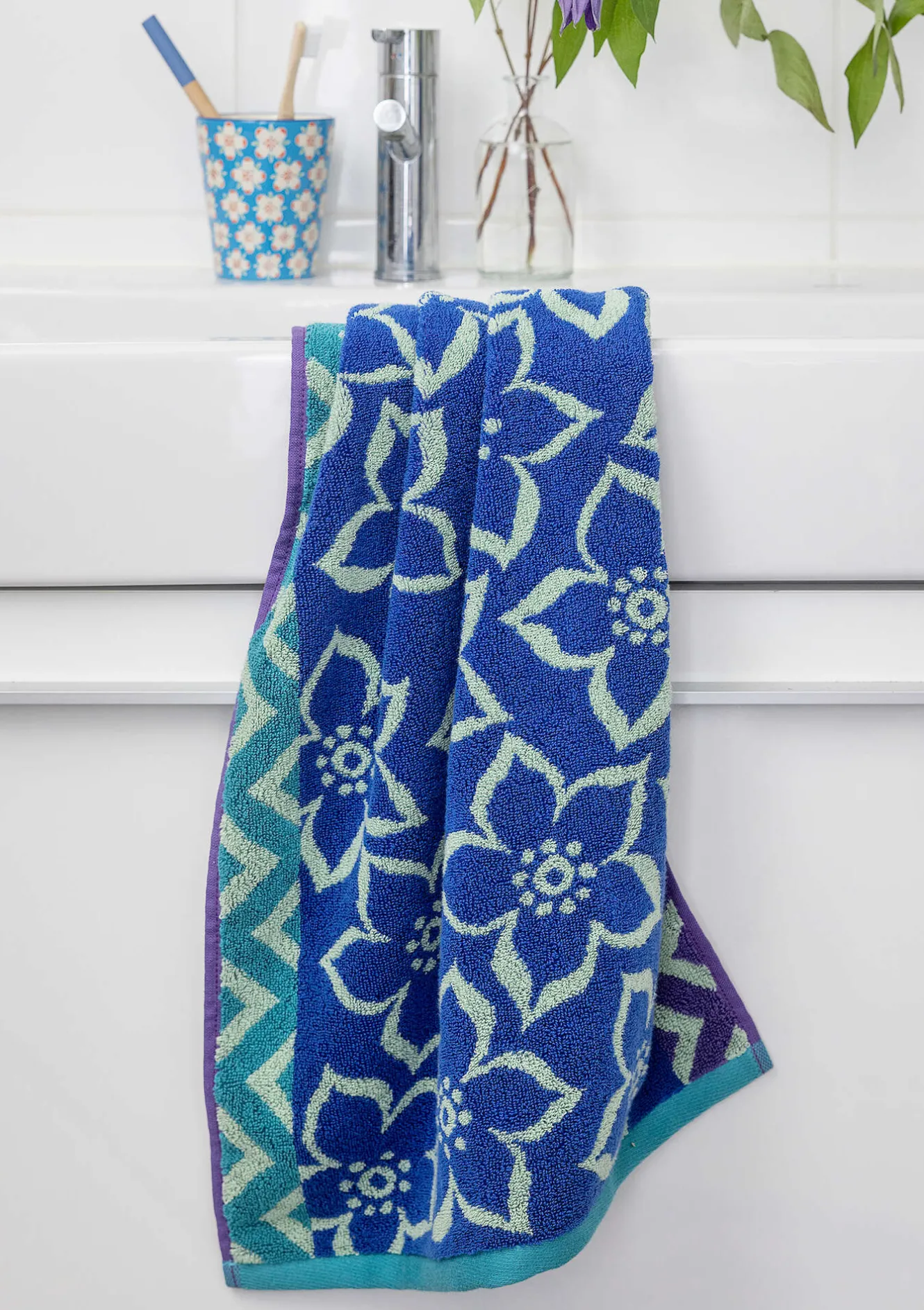 Handduk med blommönster och bårder. Kontrastfärgad kant och hängare på kort- och långsidan.