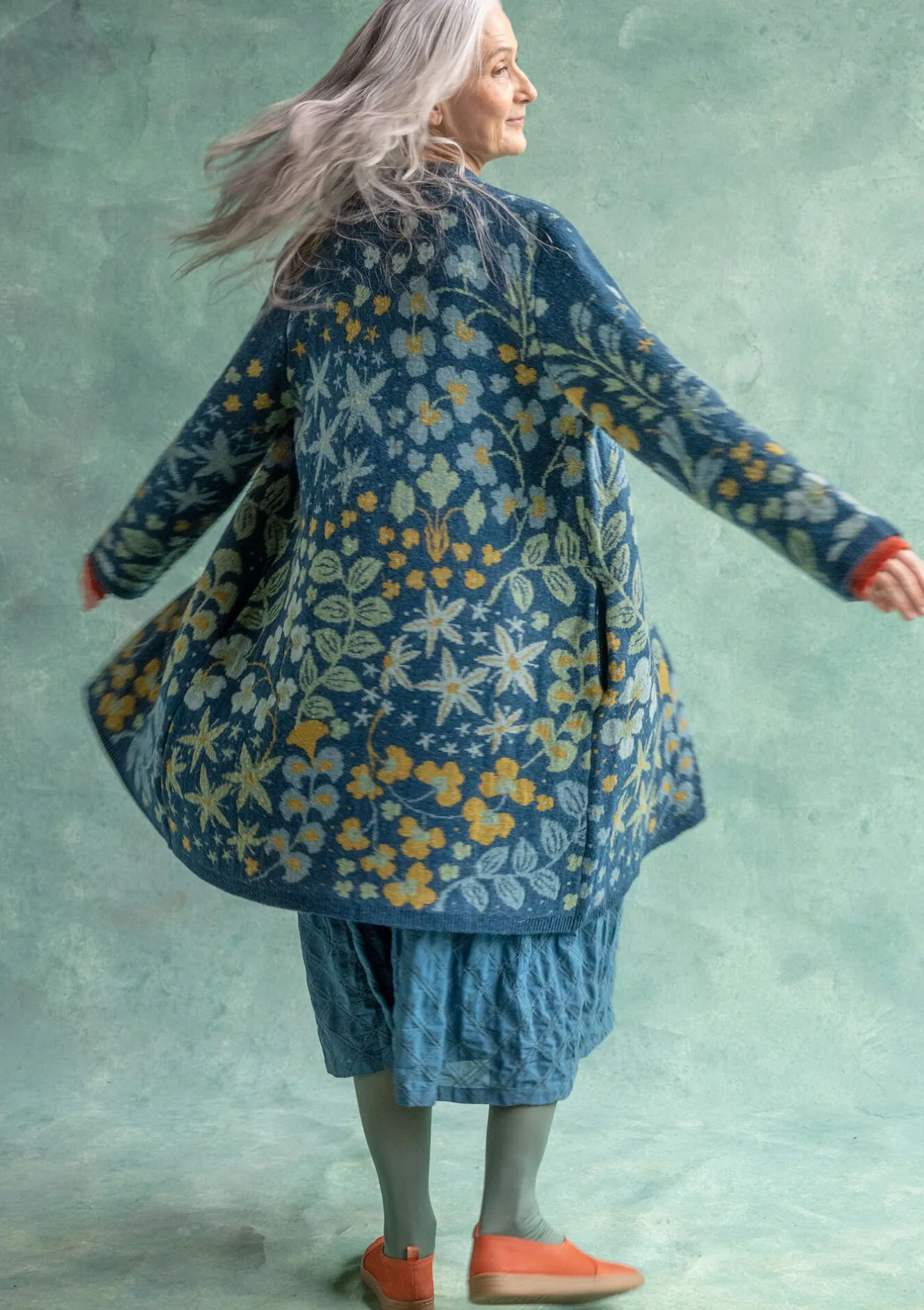 Känn dig riktigt fin i denna långa jacquardstickade kappkofta med placerad mönsterbild på både fram- och bakstycke. Modell med lång ärm, sidfickor, lite högre krage och pärlemorknappar.