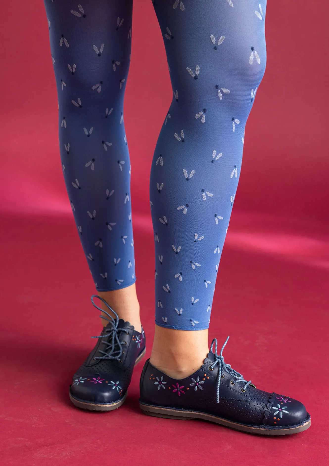 Som små spår, av fågelfötter, sprider sig mönstret ”Fjät” över vår leggings. Återvunnen fiber.