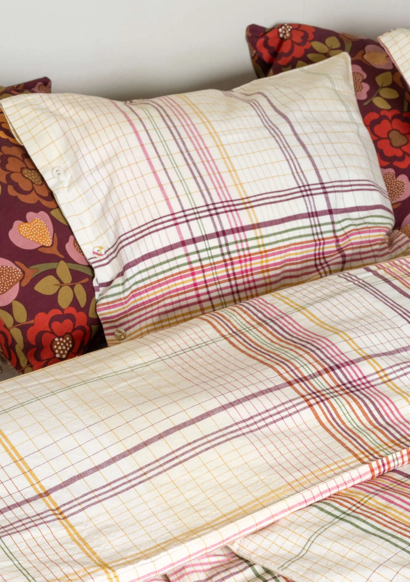 Örngott i mjuk och skön ekologisk bomull. Med ett garnfärgat vävrutigt mönster i ett rikt färgspel. Stängs med tygklädda knappar i kanten.