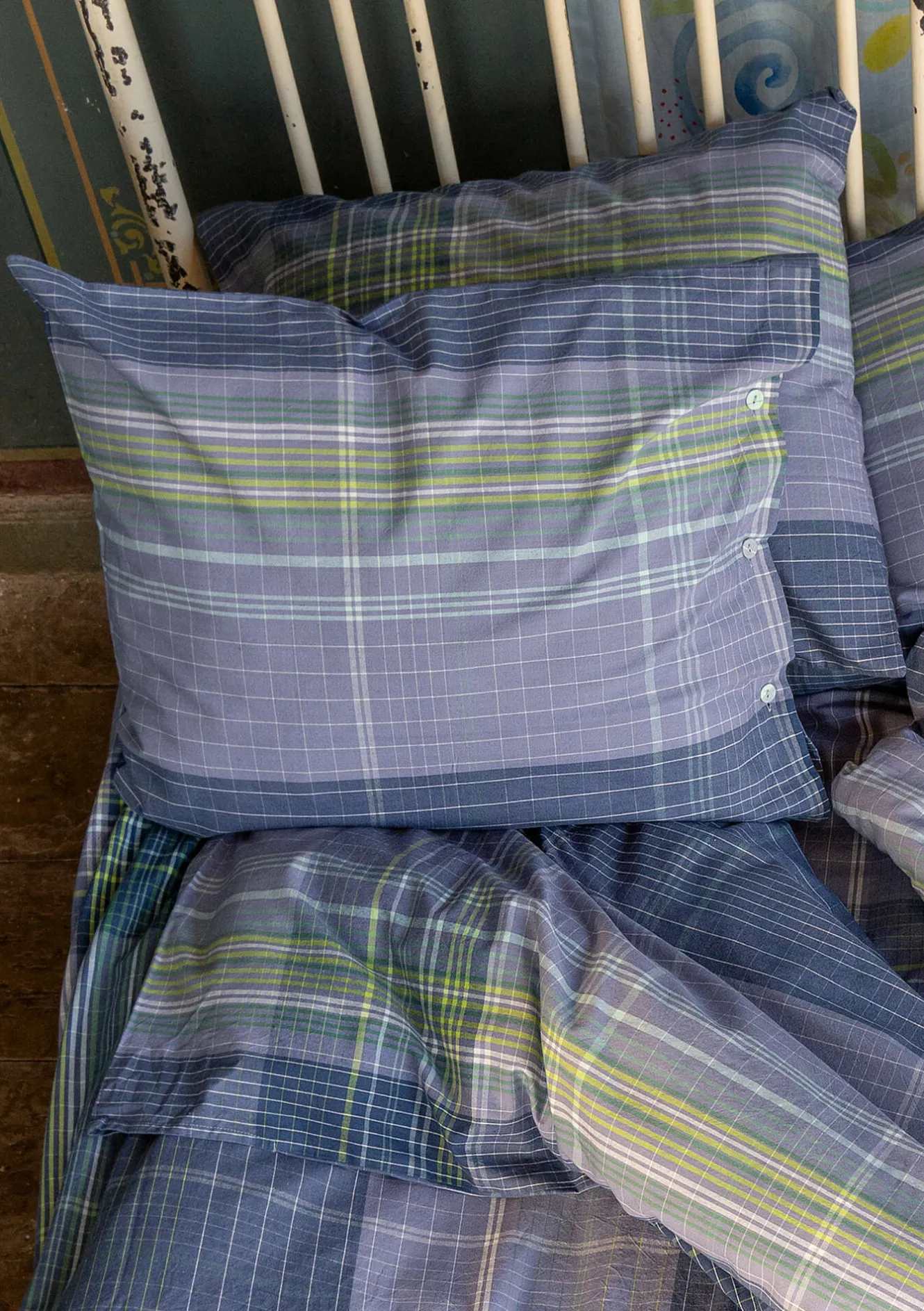 Örngott i mjuk och skön ekologisk bomull. Med ett garnfärgat vävrutigt mönster i ett rikt färgspel. Stängs med tygklädda knappar i kanten.