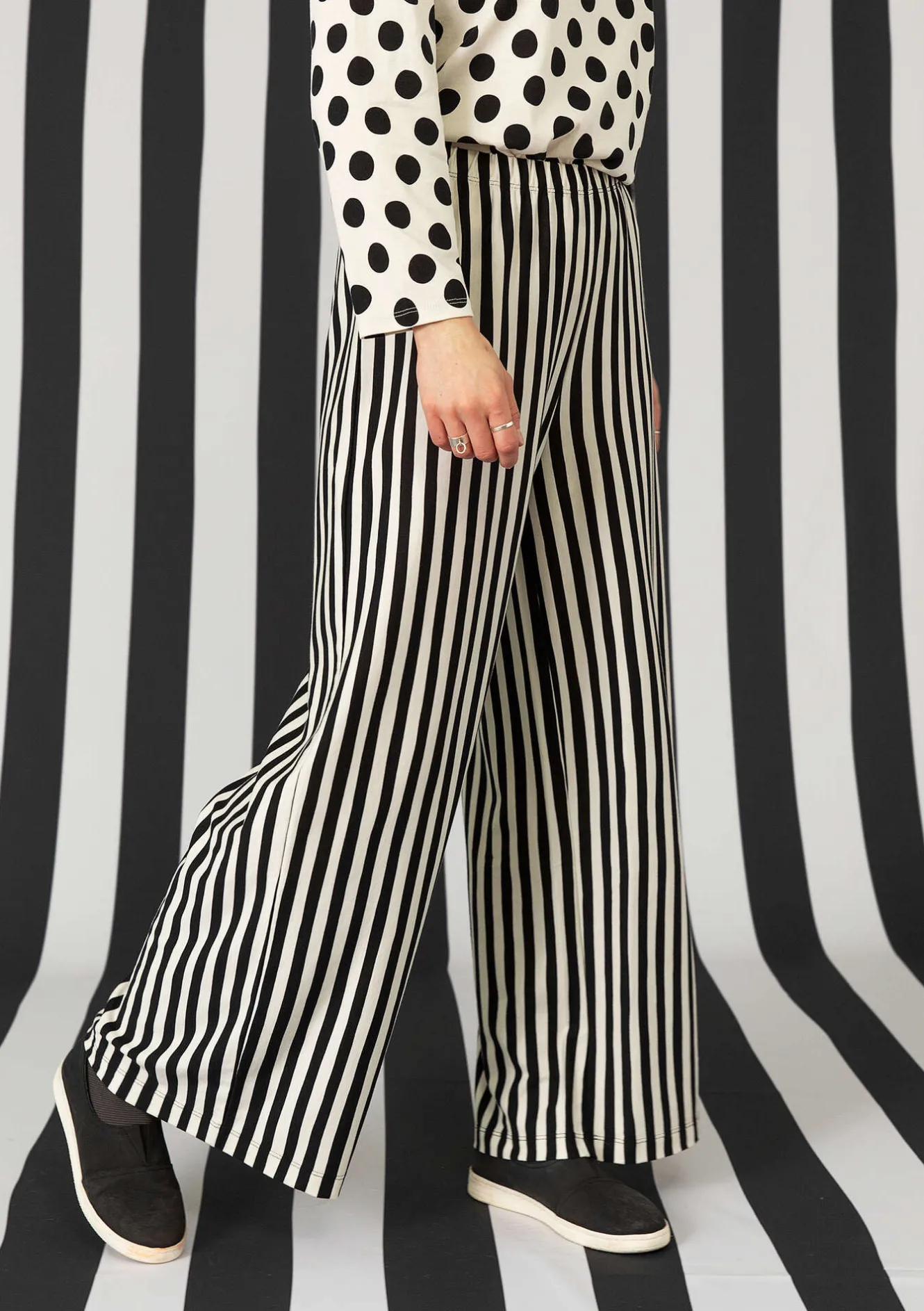 Hellång trikåbyxa med härlig vidd i benen och bekväm resår i midjan. Långrandig då vi vänt på tygriktningen.