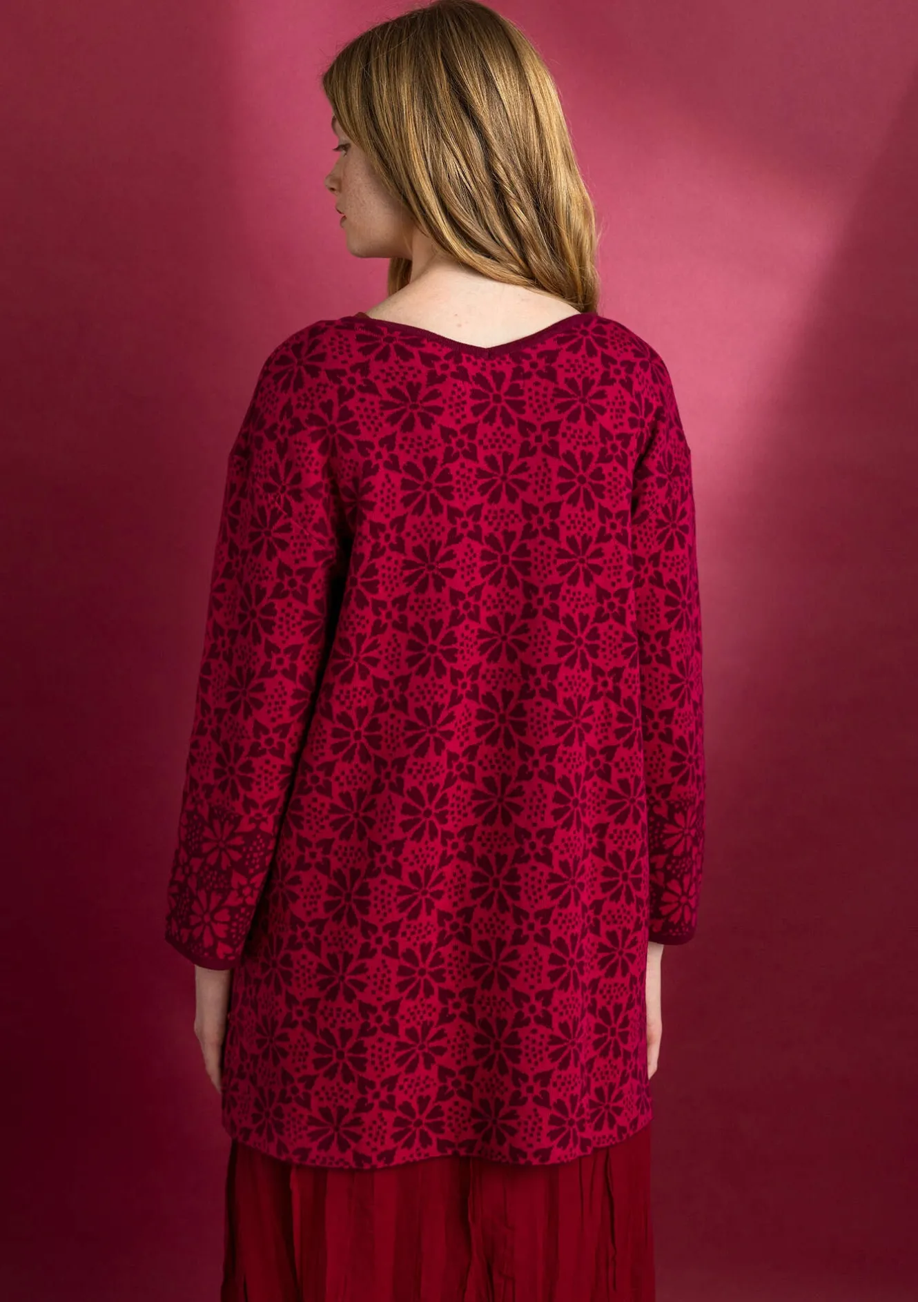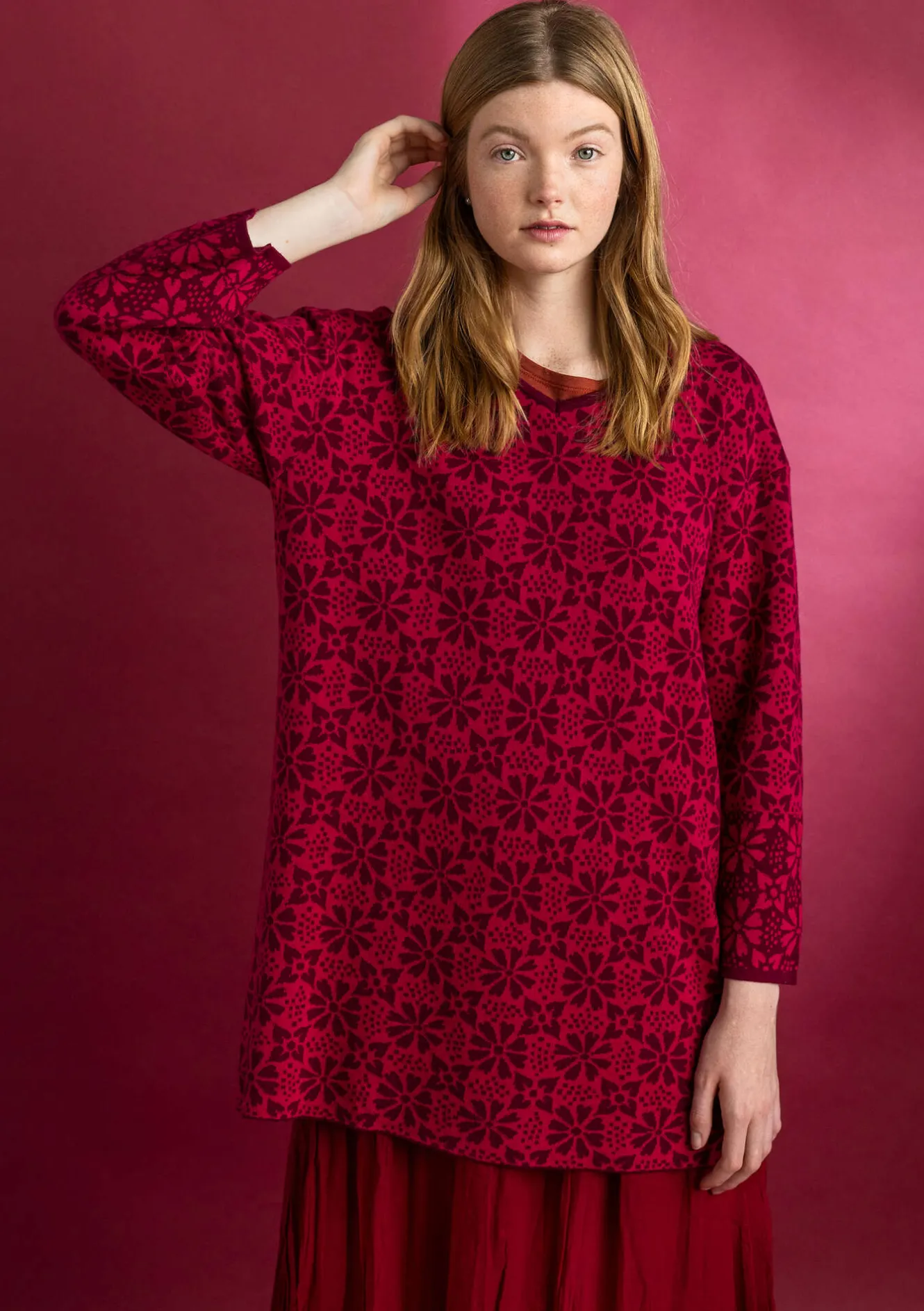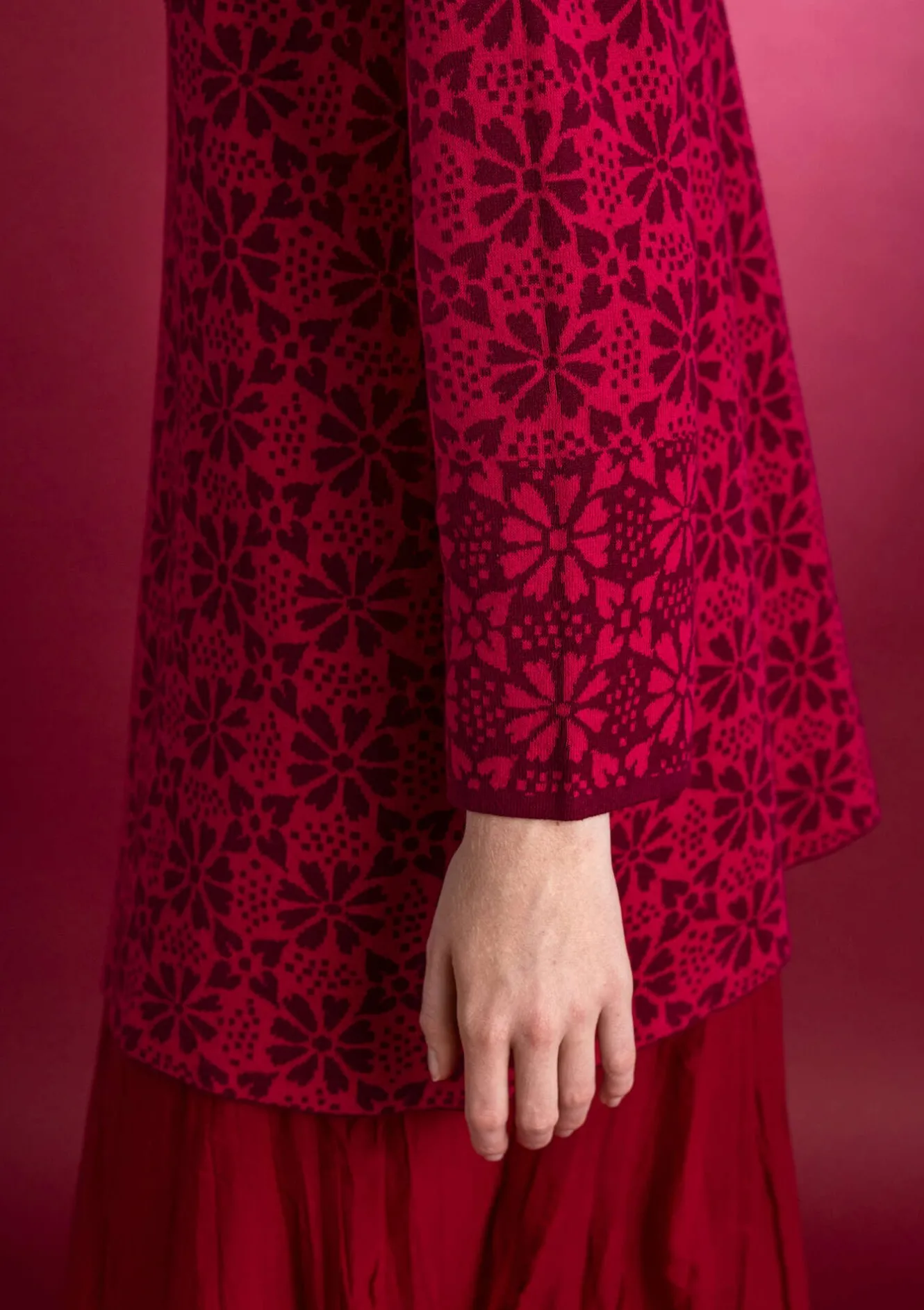 Jacquardstickad tunika med aningen kortare ärm. V-ringad i halsen både fram- och baktill. I ärmens nederkant har vi bytt placering på färgerna, vilket ger plagget en diskret bård.