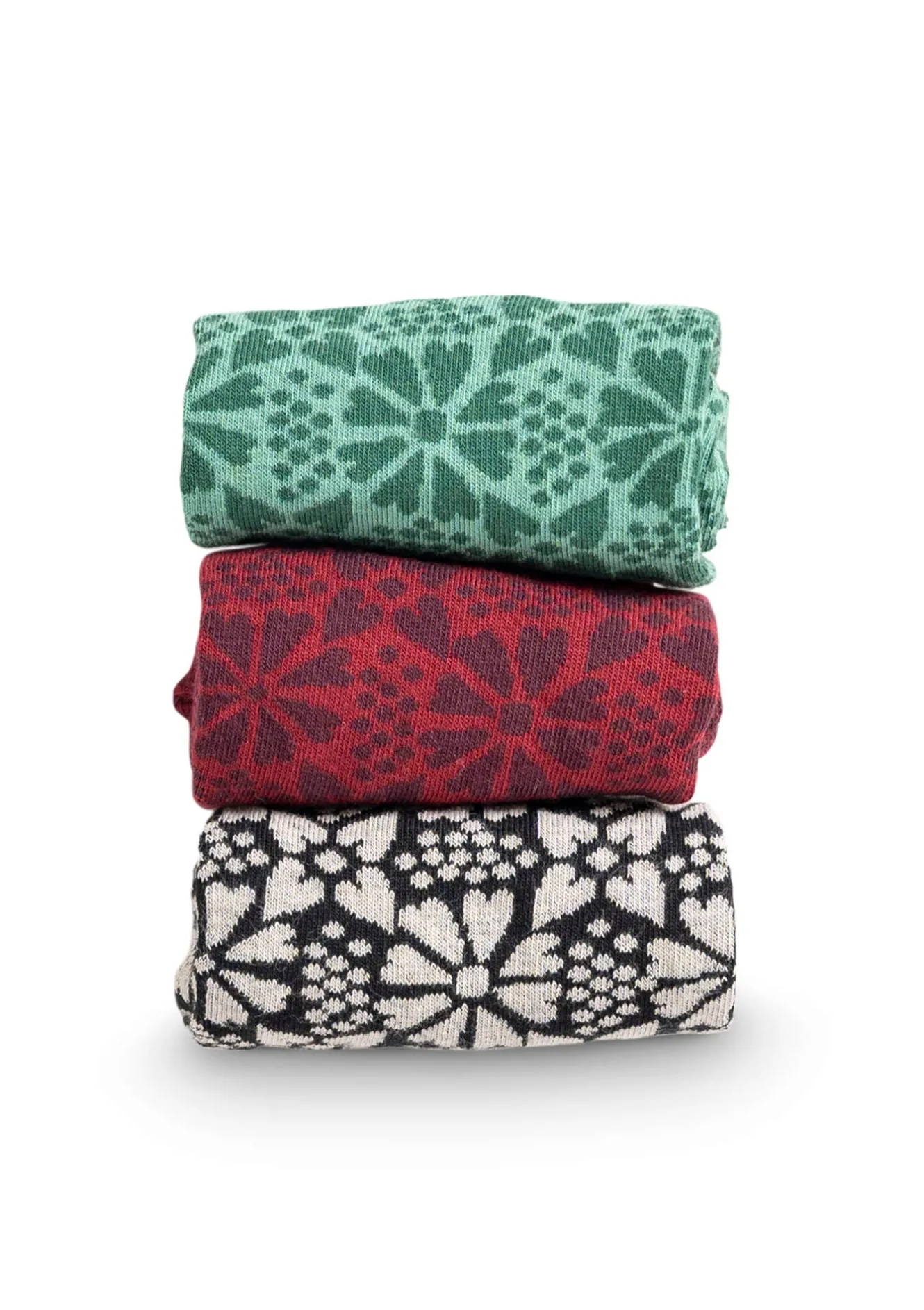 Grafiskt folkloristiska blomster pryder denna lilla strumpa. Bekväm och mjuk ribb upptill.