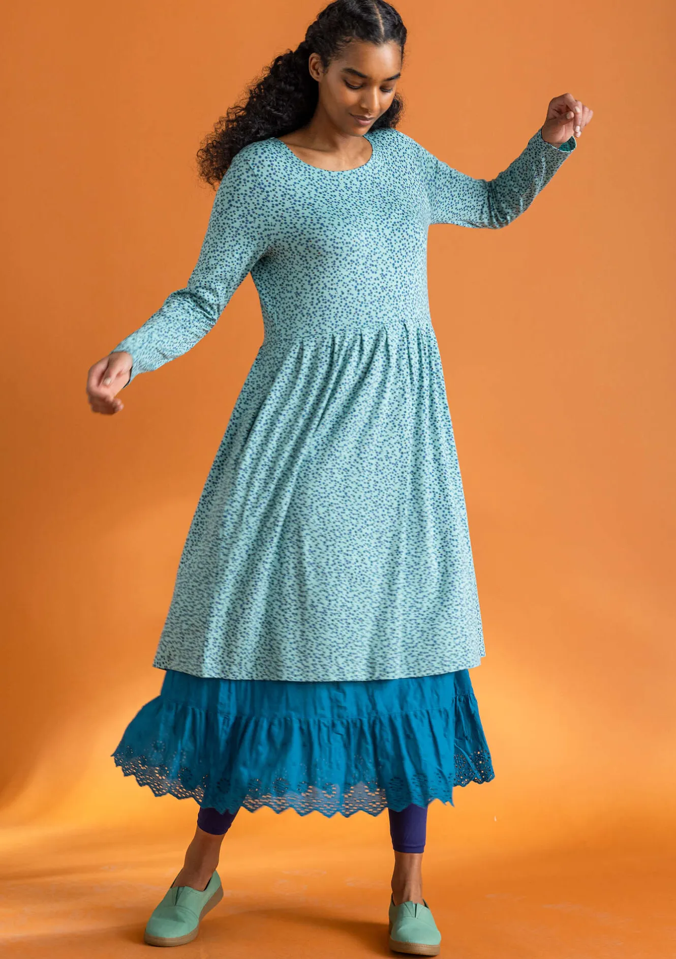 Tryckt och enfärgad klänning med rundad halsringning. Nätt upptill med en avskuren midja. Fint lagda veck runtom ger en klädsam vidd i kjolen. Hellång ärm och fickor i sidorna.