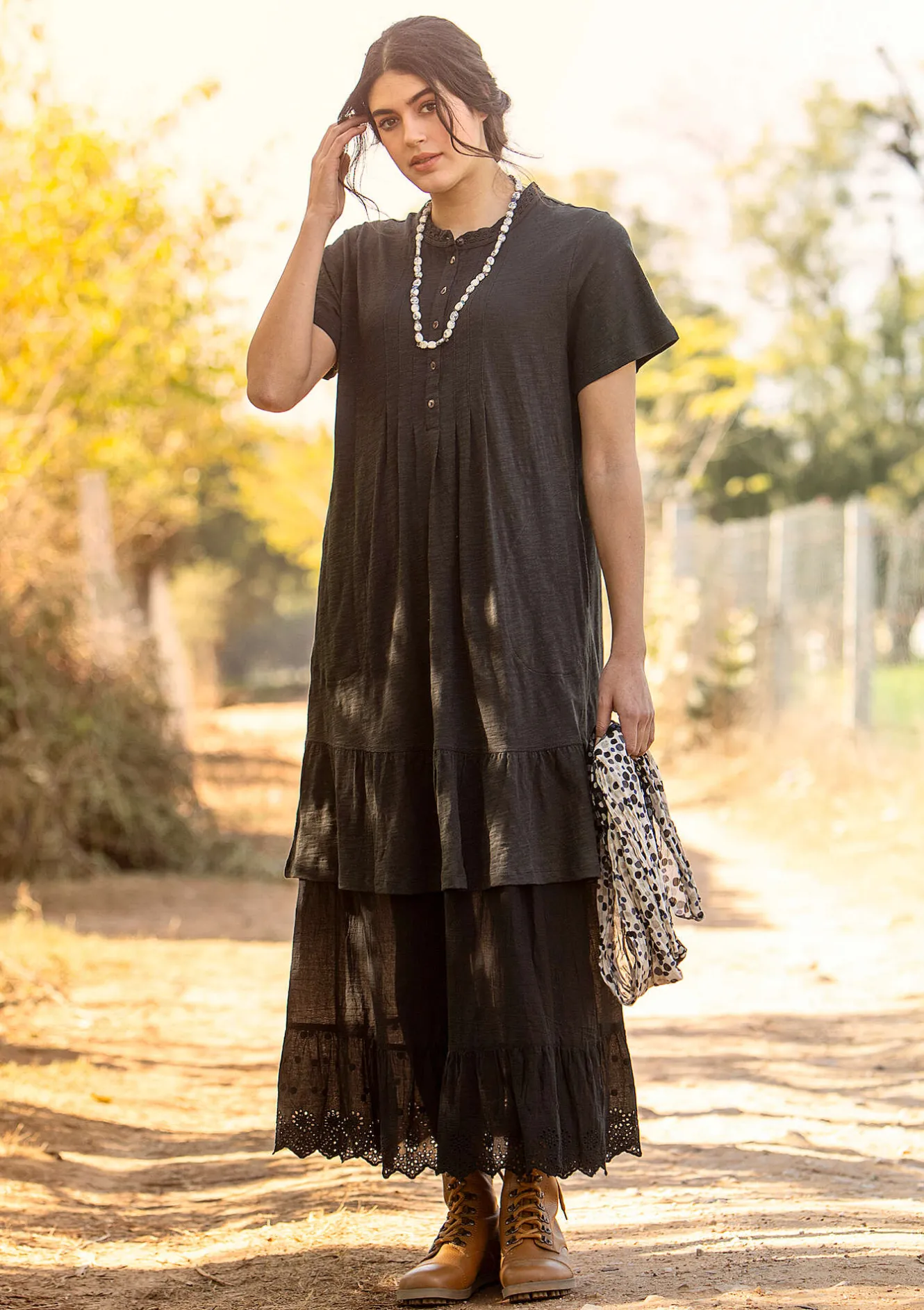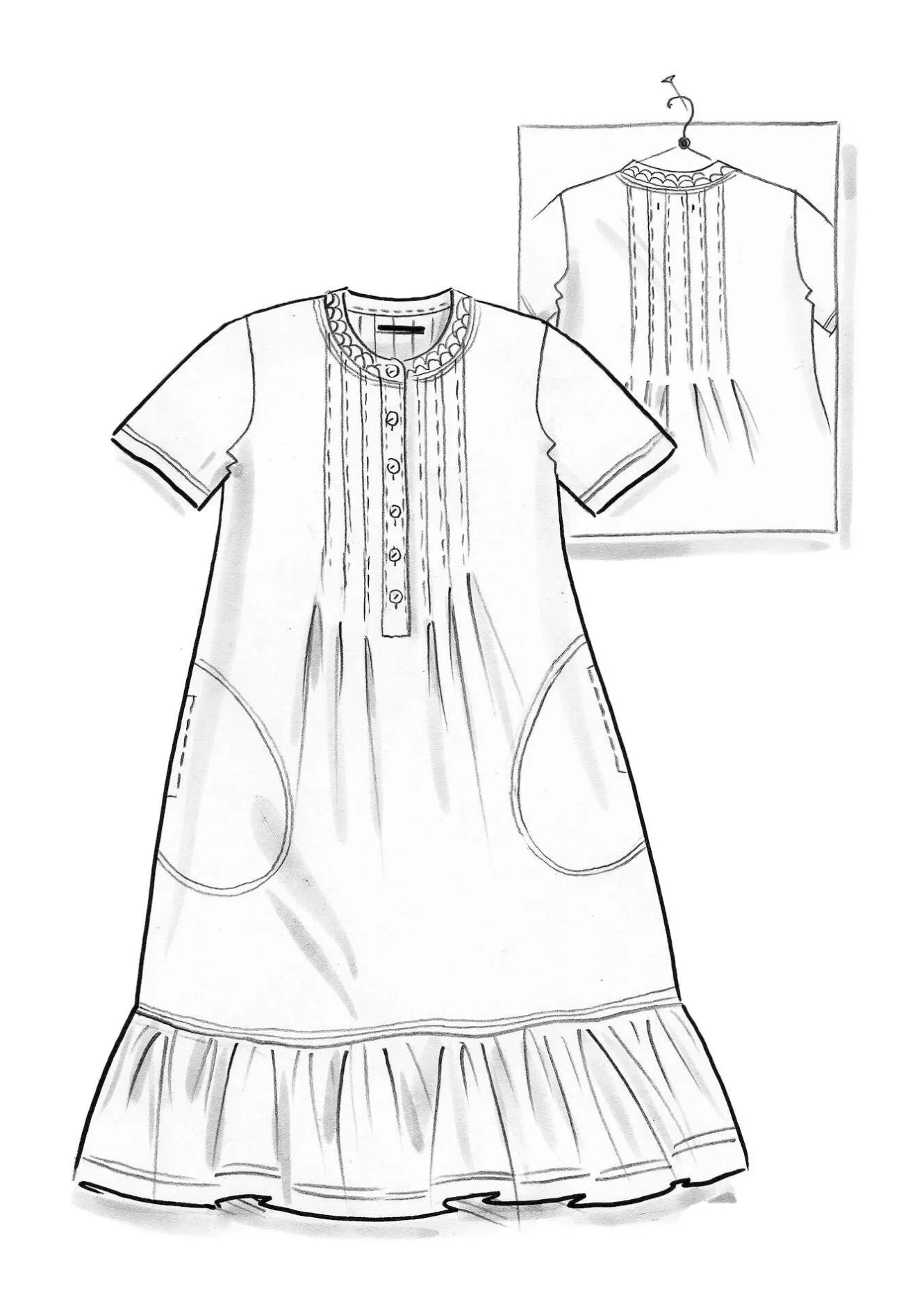 Kortärmad modell med sidfickor och en bred volang nedtill. Knäppslå upptill med infärgade pärlemorknappar samt en liten ståkrage med en romantisk spets. Stråveck på både fram- och bakstycke, vilket skapar en silhuett med mer vidd nedtill.