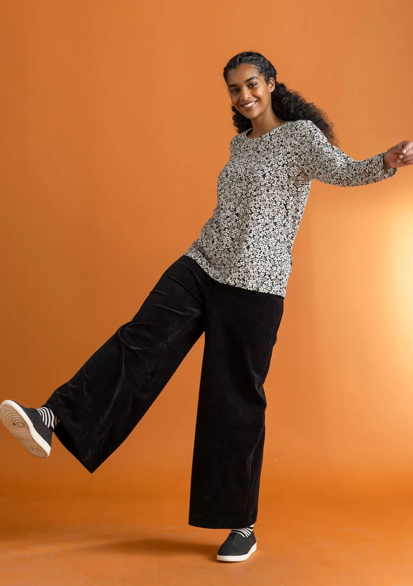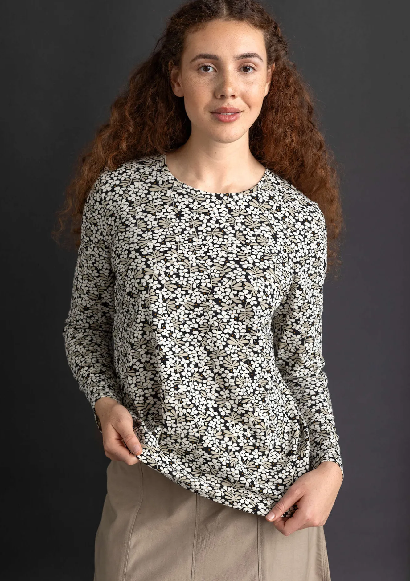 Lättburen modell med rund halsringning och hellång ärm. Kommer i både enfärgat och med den lilla tryckta blomman ”Ylva”.