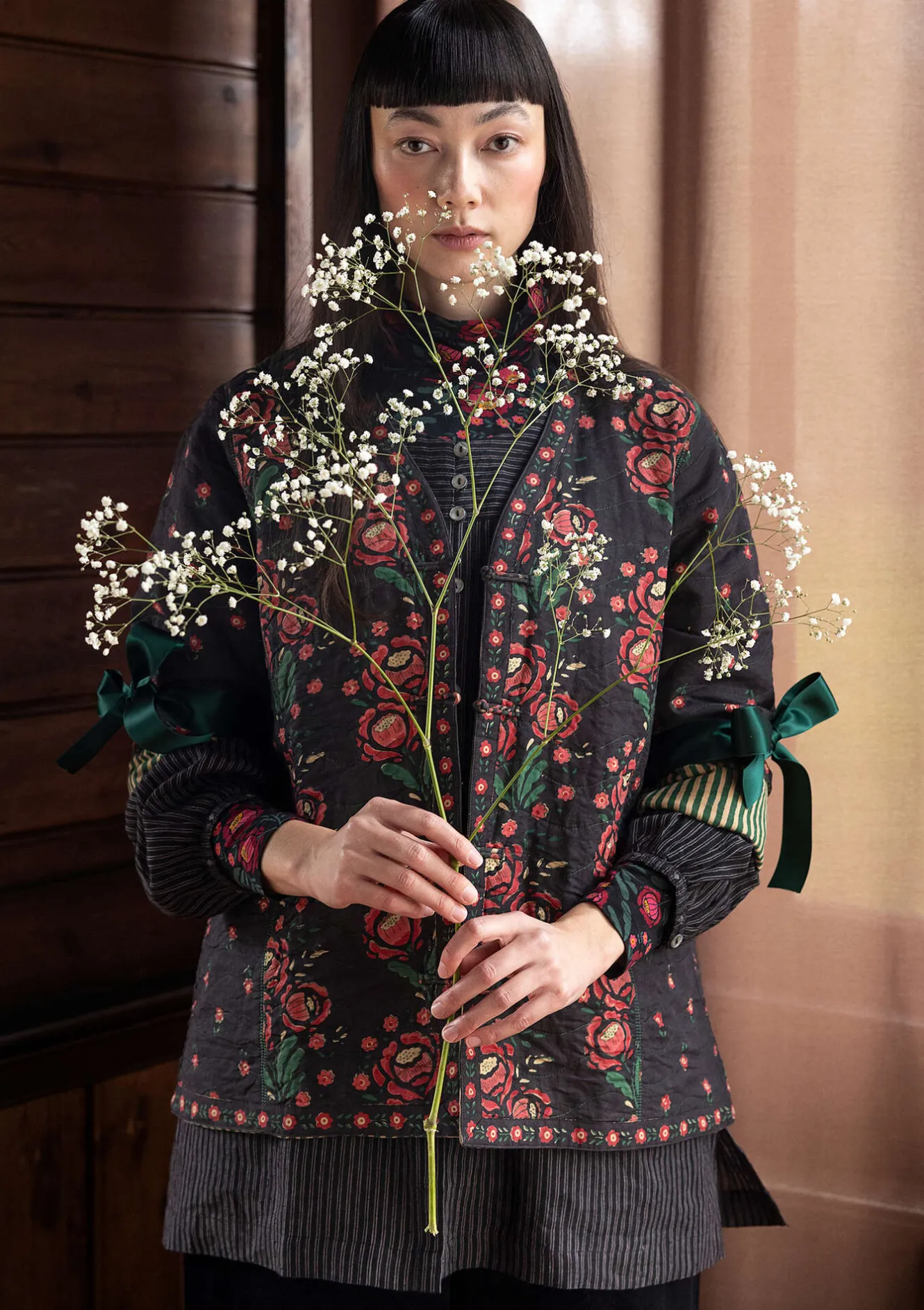 Blocktryckt jacka i en vändbar, rak modell med hellång ärm. Kviltad med ett tunt lager bomullsflanell. Sidfickor och en utanpåficka. Fint arbetad med en broderad blomma på ryggen. Knäpps med textila kinaknappar, i klassisk modell.