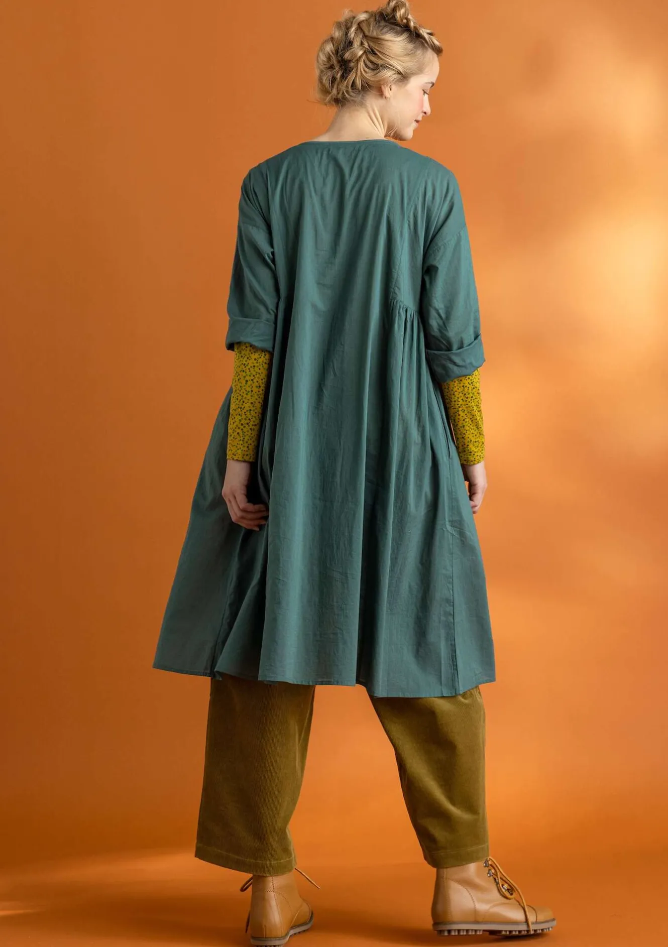 Längre modell med nedhasad, trekvartslång ärm. Plagget är sytt i våder med placerade rynkor i sidan. Knäppdetalj framtill med pärlemorknappar och sydda öglor. Dolda fickor i sidorna.