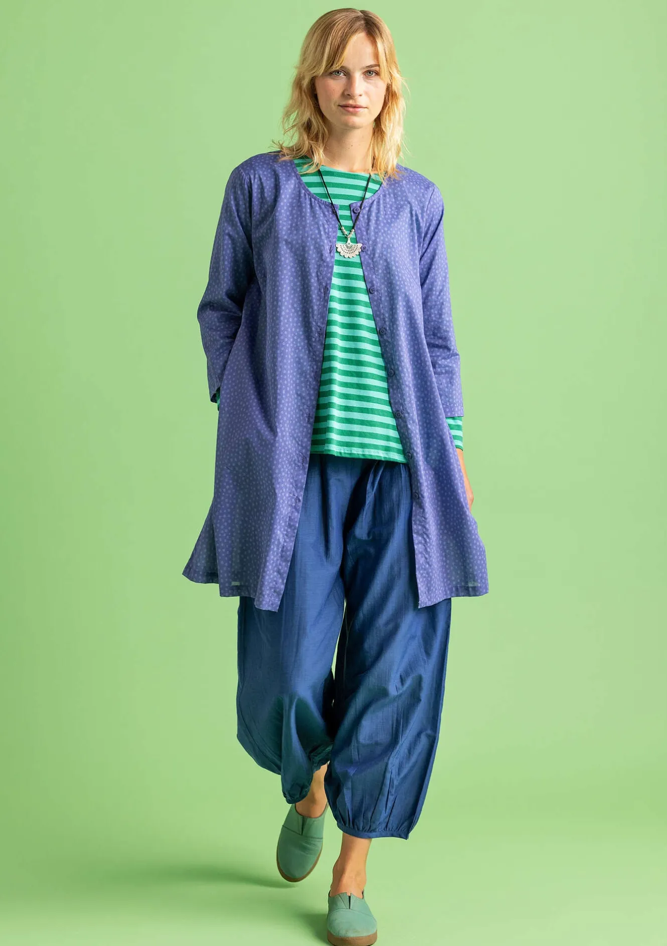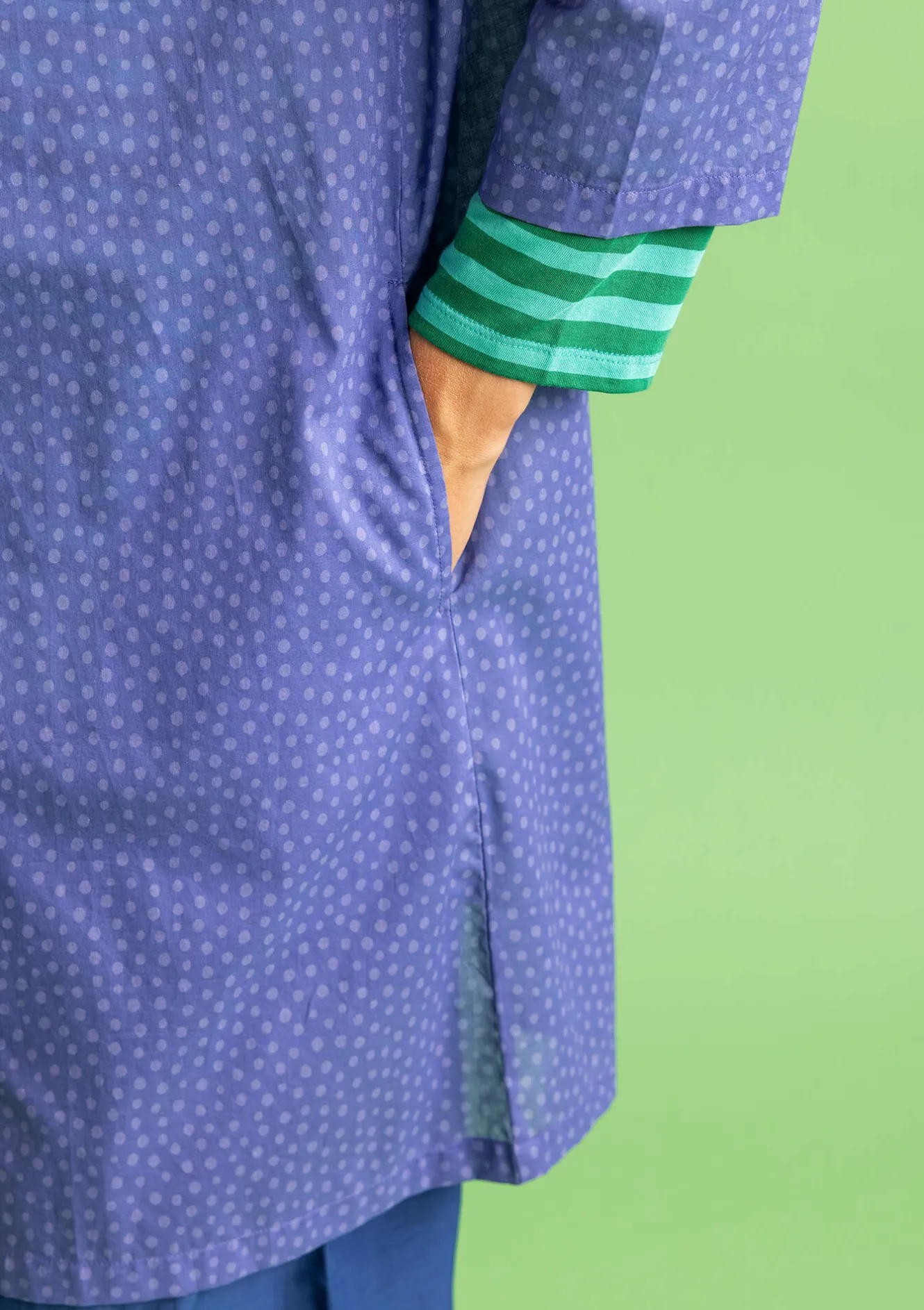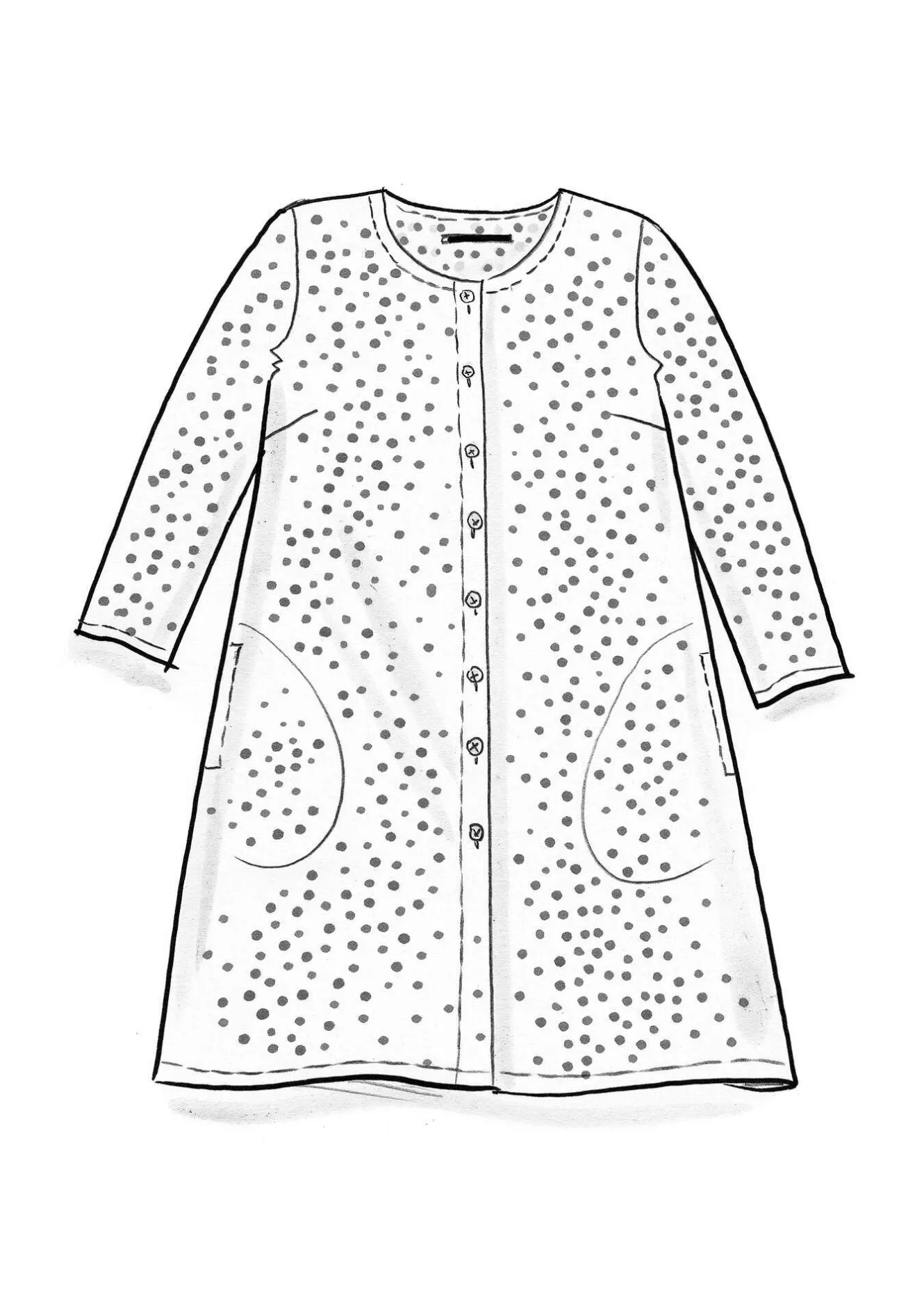 Genomknäppt tunika mönstrad med tryckta små prickar. Lättburen modell med rund halsringning och trekvartslång ärm. Dolda fickor i sidorna.