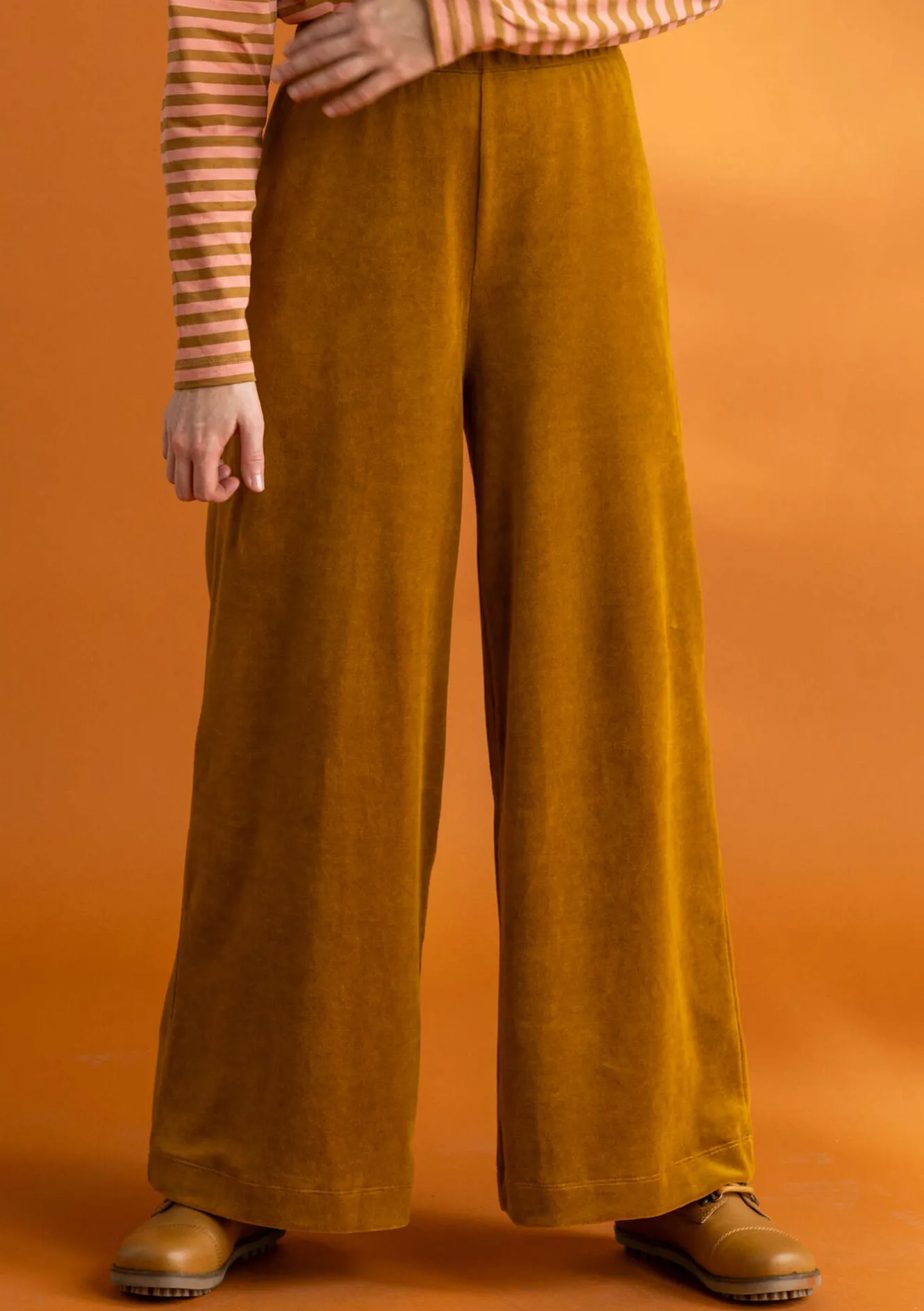 Hellång byxa i vår enfärgade, mjuka velour. Isydd, bekväm resår upptill. Mysigt och värmande i fina djupa toner.