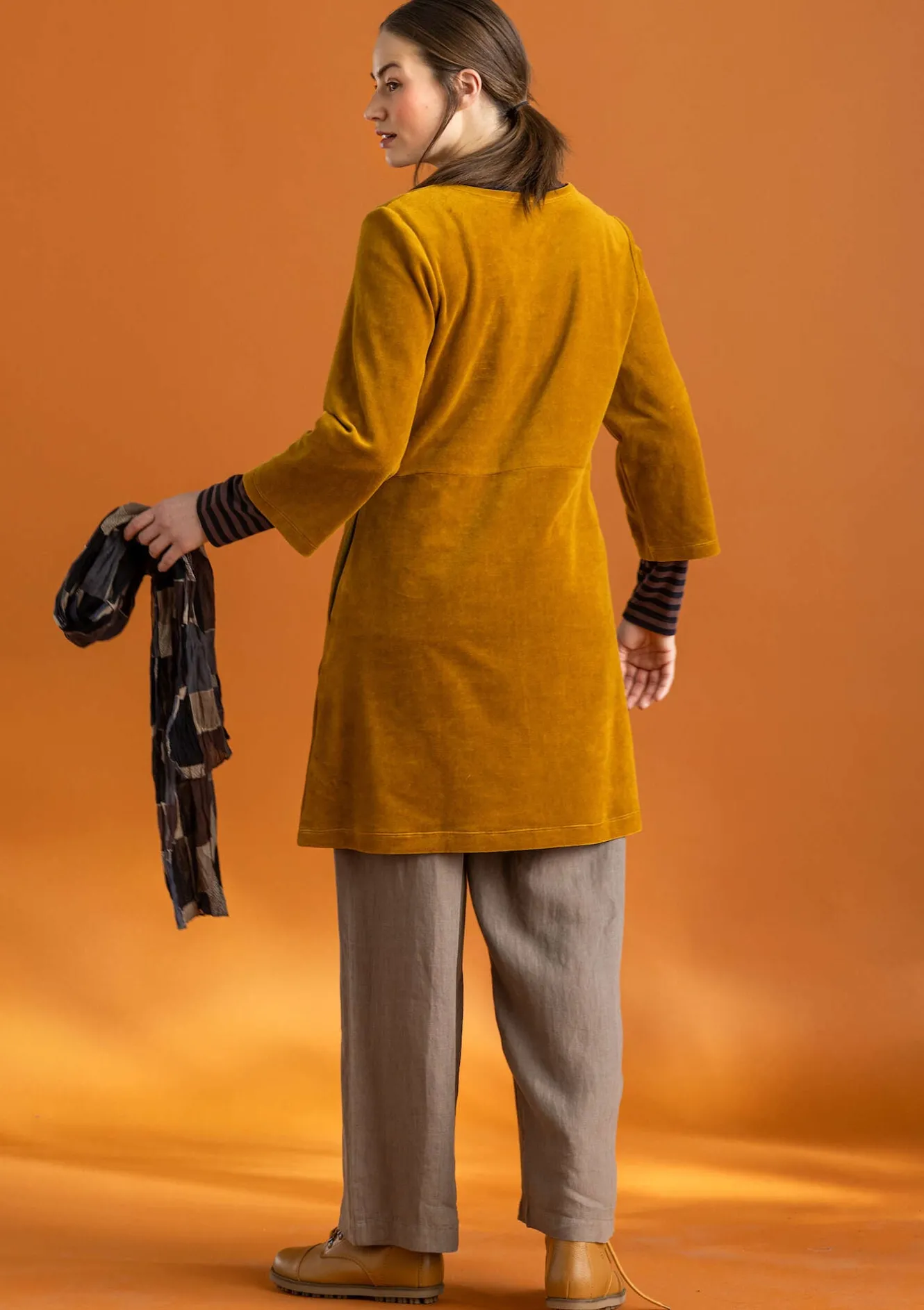 Lättburen modell i fin velourkvalitet. Aningen nättare upptill med lite mer vidd i nederdelen. Trekvartslång ärm och dolda fickor i sidorna.